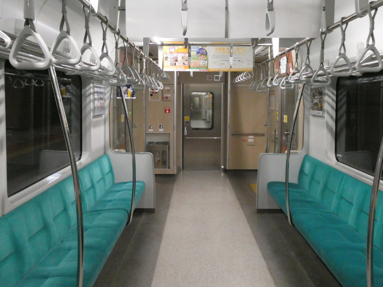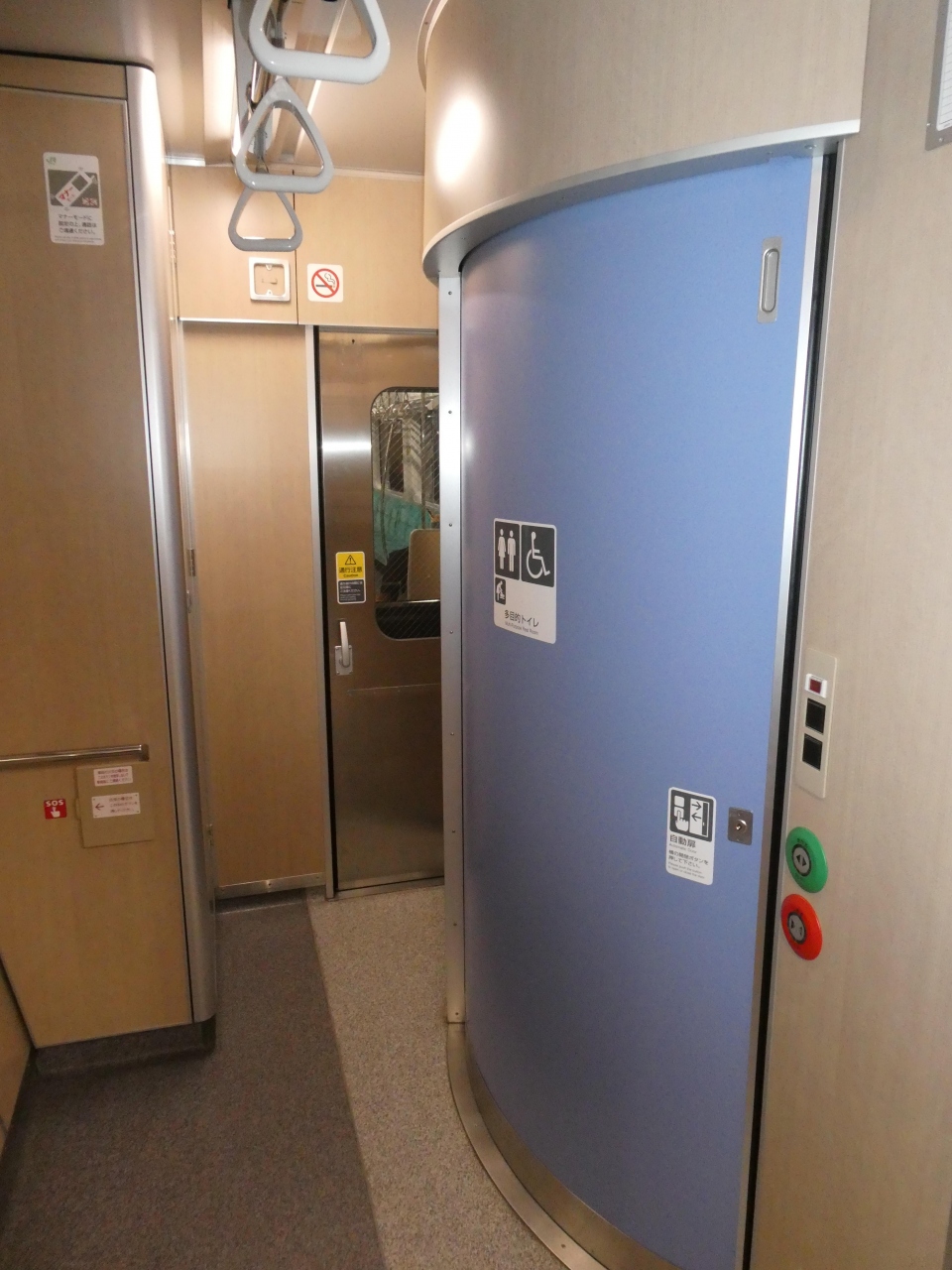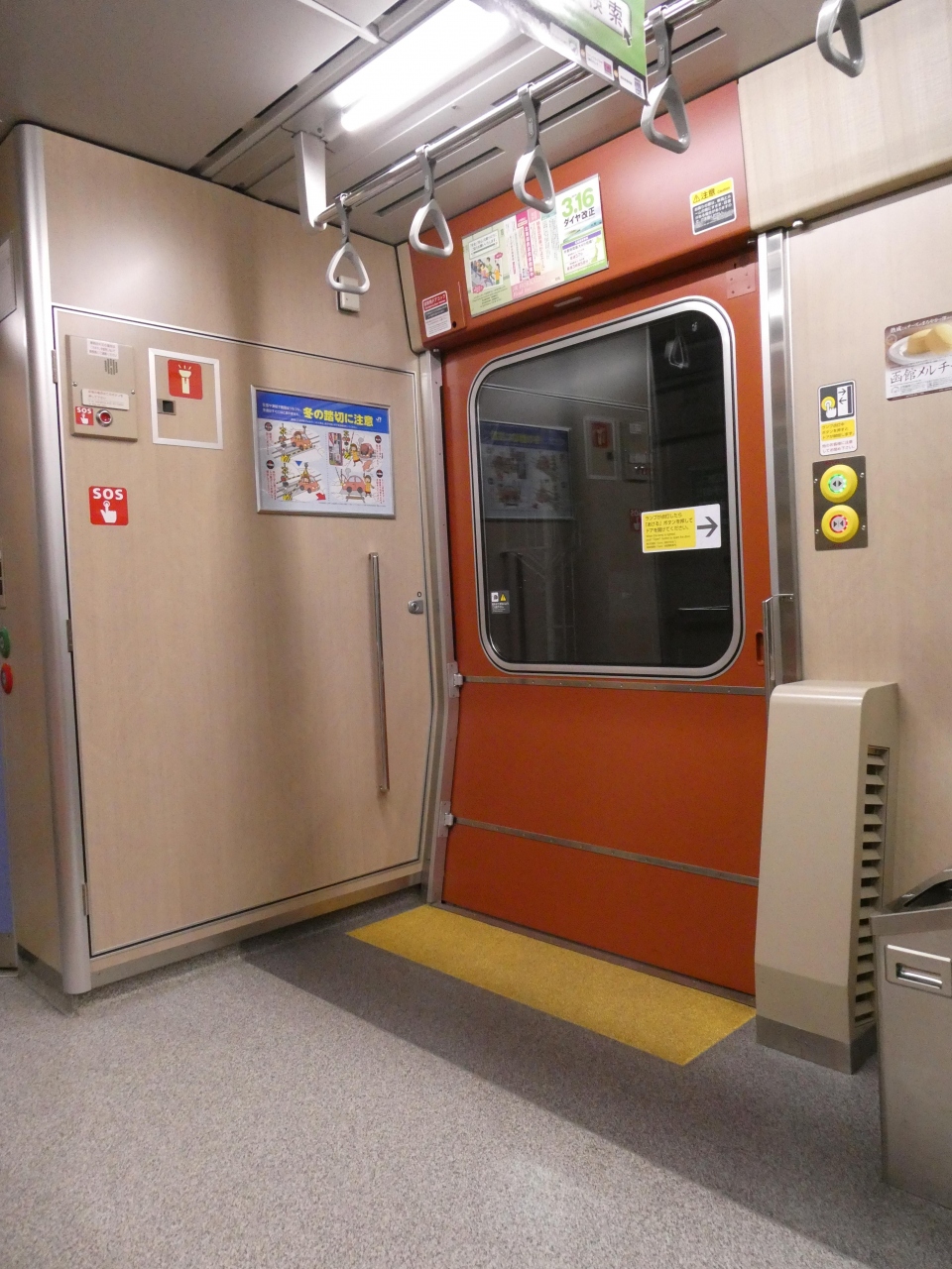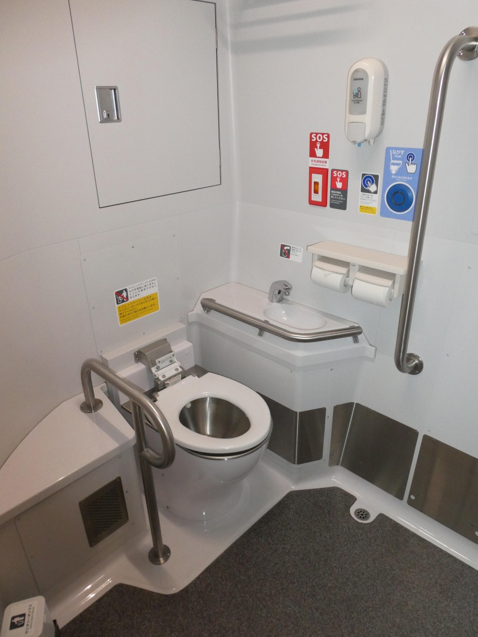 カラフルなロングシートの車内には大きなトイレが設置されていました。