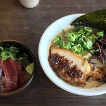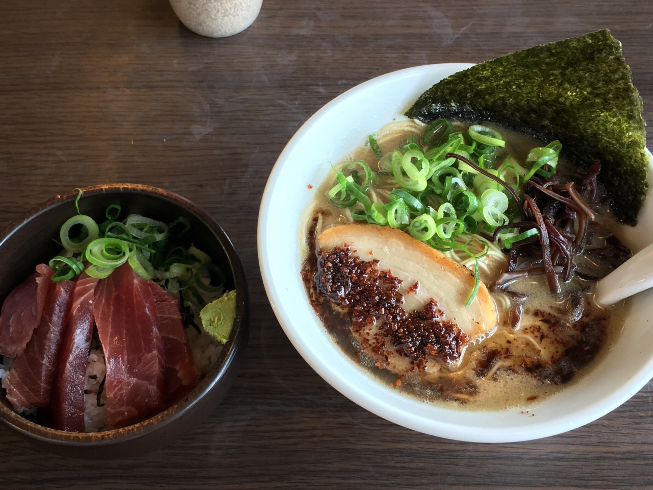 九州とんこつラーメンの地元人気店です。ランチはサービスの大盛りをオーダーするも、スープに対し麺が多く、汁なし麺になってしまいました。プラスで小どんぶりのまぐろ丼をいただいたので、満腹ごちそうさまです。