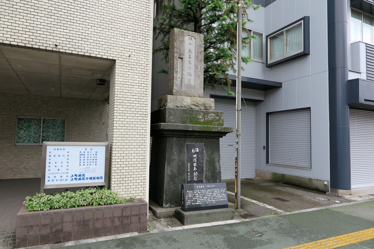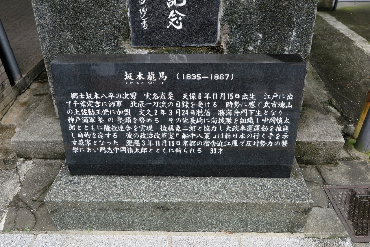 坂本龍馬が誕生した場所に「坂本龍馬先生誕生地」という碑が建てられています。現在の碑は3代目で、1952年(昭和27年)のもので、1968年(昭和43年)に台座が設けられ、現在の形になったようです。揮毫は当時の首相の吉田茂、父親が土佐藩士竹内綱、自由民権運動で活躍しました。初めは木製の柱であった碑が、昭和3年、高知市による史跡標柱建設事業の一環で花崗岩で建て直される際、龍馬誕生の地に限っては、上町有志が予算を追加して大きな碑にしたということで、それが現在の大きな碑の原点なのでしょうね。碑の前に「歴史の道総合案内」の看板がありますので、それが目印になります。