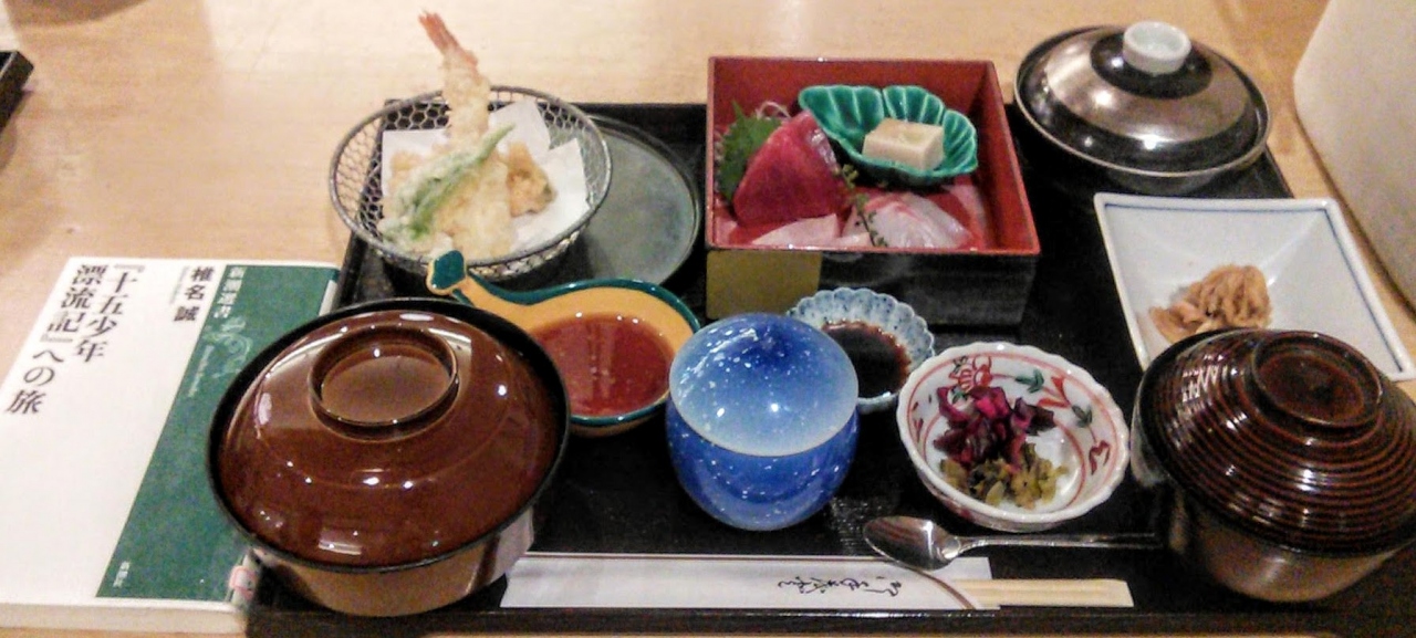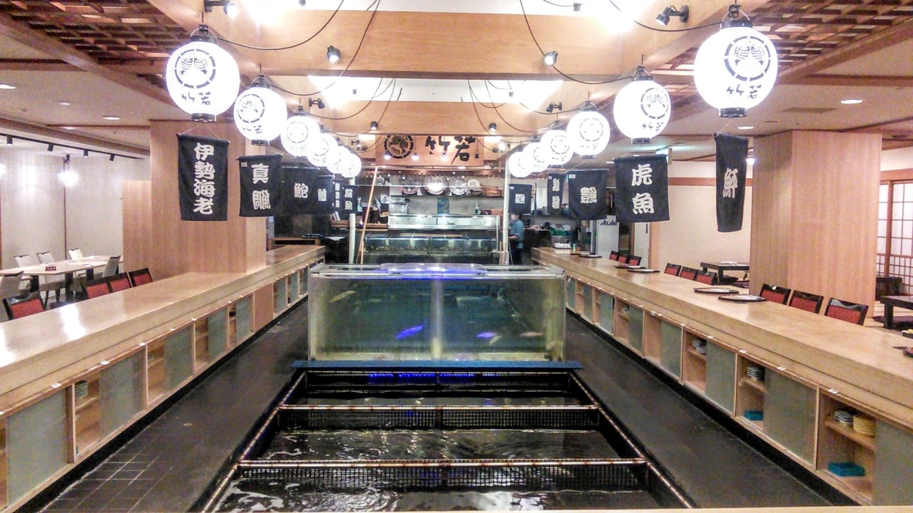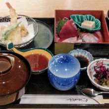 築地市場移転で築地店は閉店し、現在はこの池袋店が竹若の本店となっています。都内最大級のいけすをカウンター席がぐるりと囲んでいるので、目の前を泳ぐ魚、水槽の照明で青く輝いているイカなどを眺めながら、食事ができます。看板メニューの竹若御膳をいただきました。新鮮なお刺身、てんぷら、茶碗蒸し、煮物などが付く充実した内容の和食ランチです。他に、にぎりずしランチ、手打ちそばランチがありました。