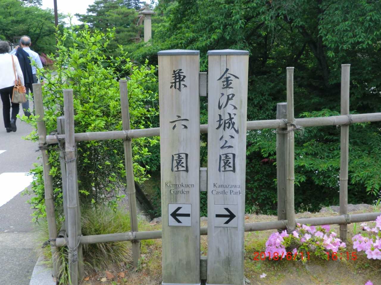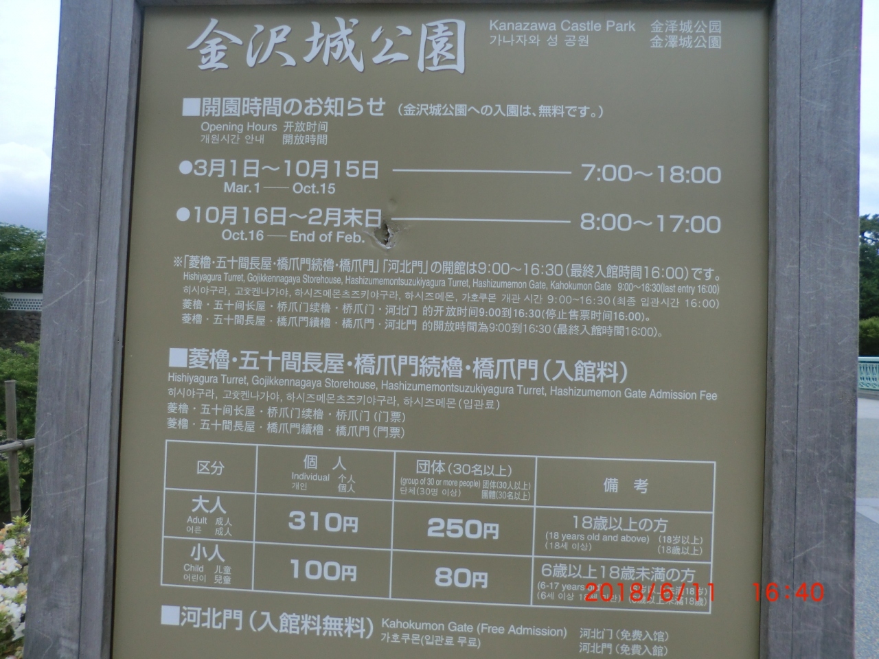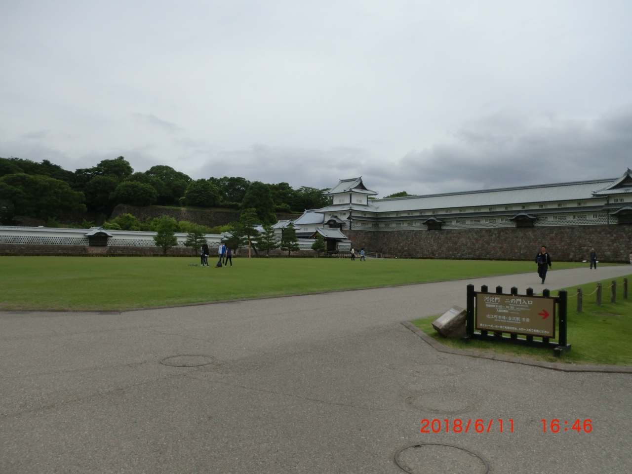 金沢城公園、金沢城址公園で城に係る門や櫓や広場やその他沢山の建築物があり、現在は南北800m位、東西600m位の広さの「金沢城公園」なってます。天守閣はありませんでした。金沢城の築城は500年前の戦国時代です。250年位前には大火にあったり、雷が落ち天守閣が焼失したりしてなくなったようです。