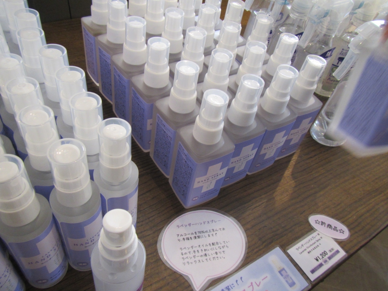 2020年はコロナ禍の影響か、ラベンダーの香りの手指消毒用アルコールや室内除菌用アルコール製品を販売していました。