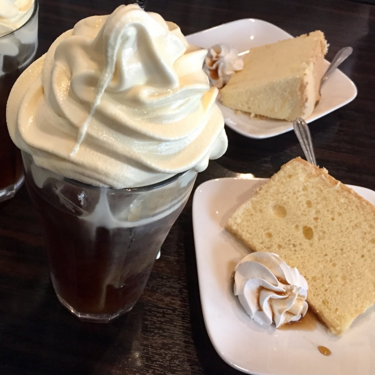 オムライスが有名ですが、今回はカフェタイムでドリンク代でシフォンケーキサービスでしたので、アイスコーヒーフロートを注文しました。おかわりドリンクが+110円でいただけたので、おかわりはホットコーヒーで。