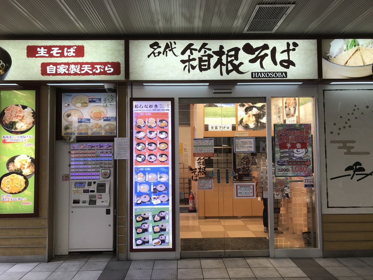 新百合ヶ丘は改札内外にそれぞれ店舗があるので使い勝手は良いのですが、改札内のこちらの店舗は東口側になるので注意が必要です(中央から入ってもホーム越しに行くことはできます) チェーン展開している箱根そば。食べ慣れている人なら安心できますし、初めての人でも外れのメニューはないと思うので安価でサクッと食事を済ませたいときにオススメです。