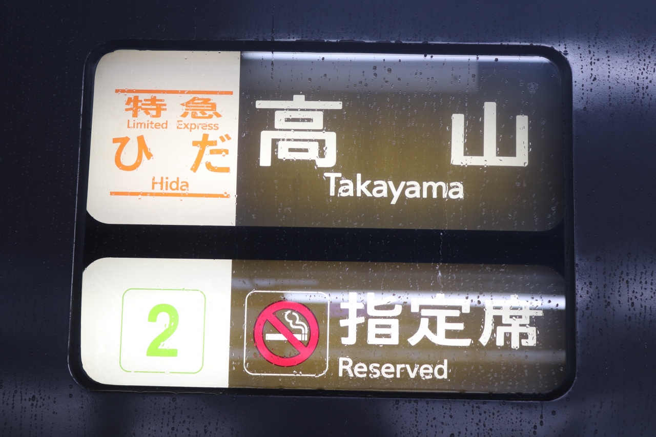 名古屋と高山、富山を結ぶ高山線の特急。電化はされていないので気動車の窓の大きいワイドビュー車両が使われています。名古屋を出る時に席は逆向きです。岐阜でスイッチバックして高山線に入ります。木曽川、飛騨川の車窓を楽しみながら、高山への旅でした。