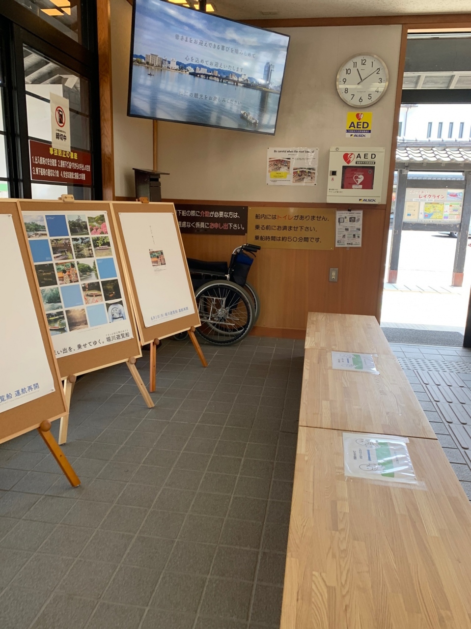 松江城のお堀を小舟でまわるツアーを体験できます。平日だったので空いていました。最近リニューアルされた待合室もきれいで、新しいカフェも入っていてよかったです。待合室のベンチは感染対策で座れない場所も等間隔に設けられていました。
