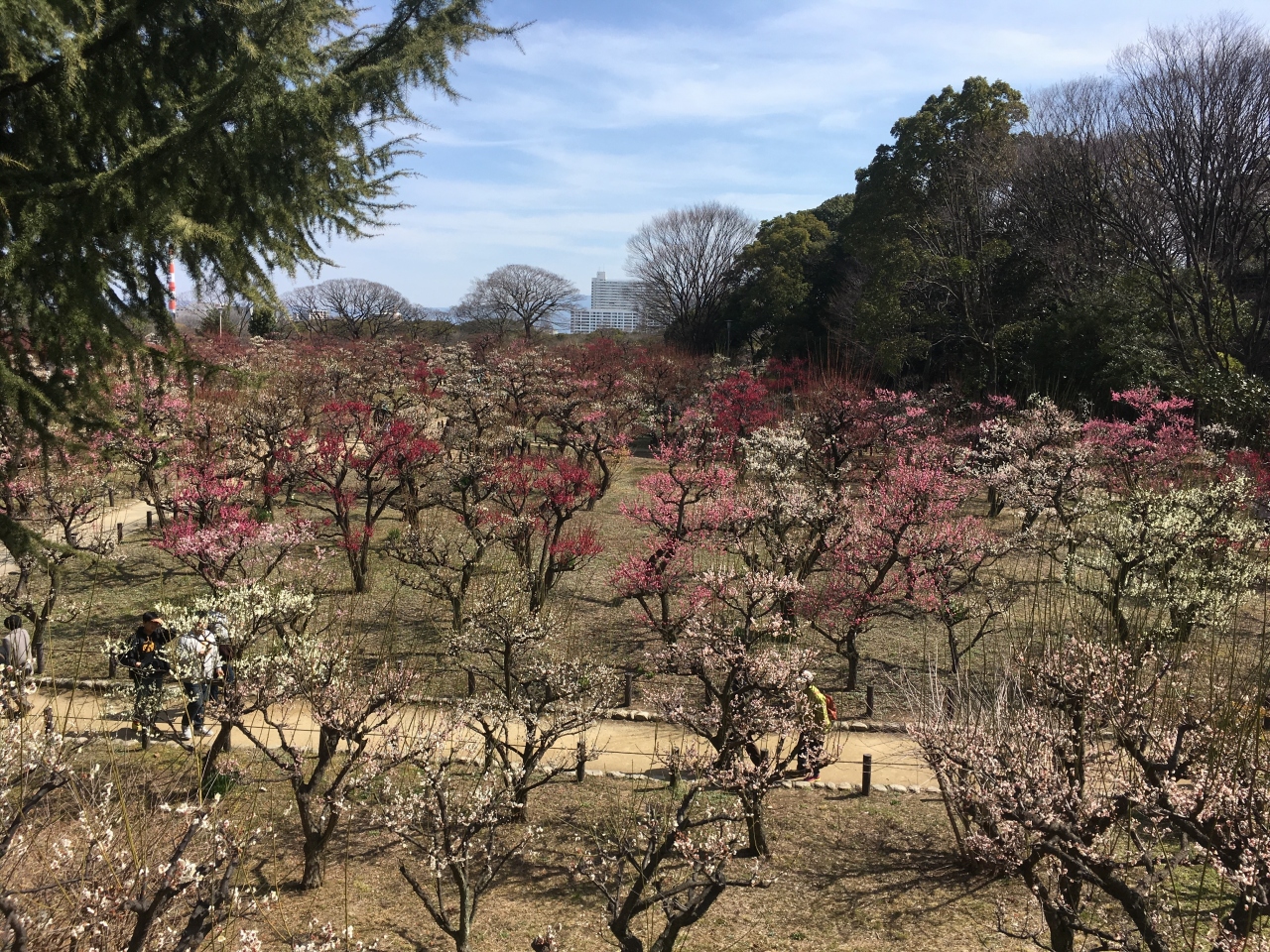 2月に行きましたので丁度梅が咲く季節に当たりました、こんな広い梅林があると思わなかったので、意外でした。白、ピンク、赤三色もあって、見応えがありました。ただ梅林と大阪城を一緒に写真を撮れるポイントを見つからなくて残念