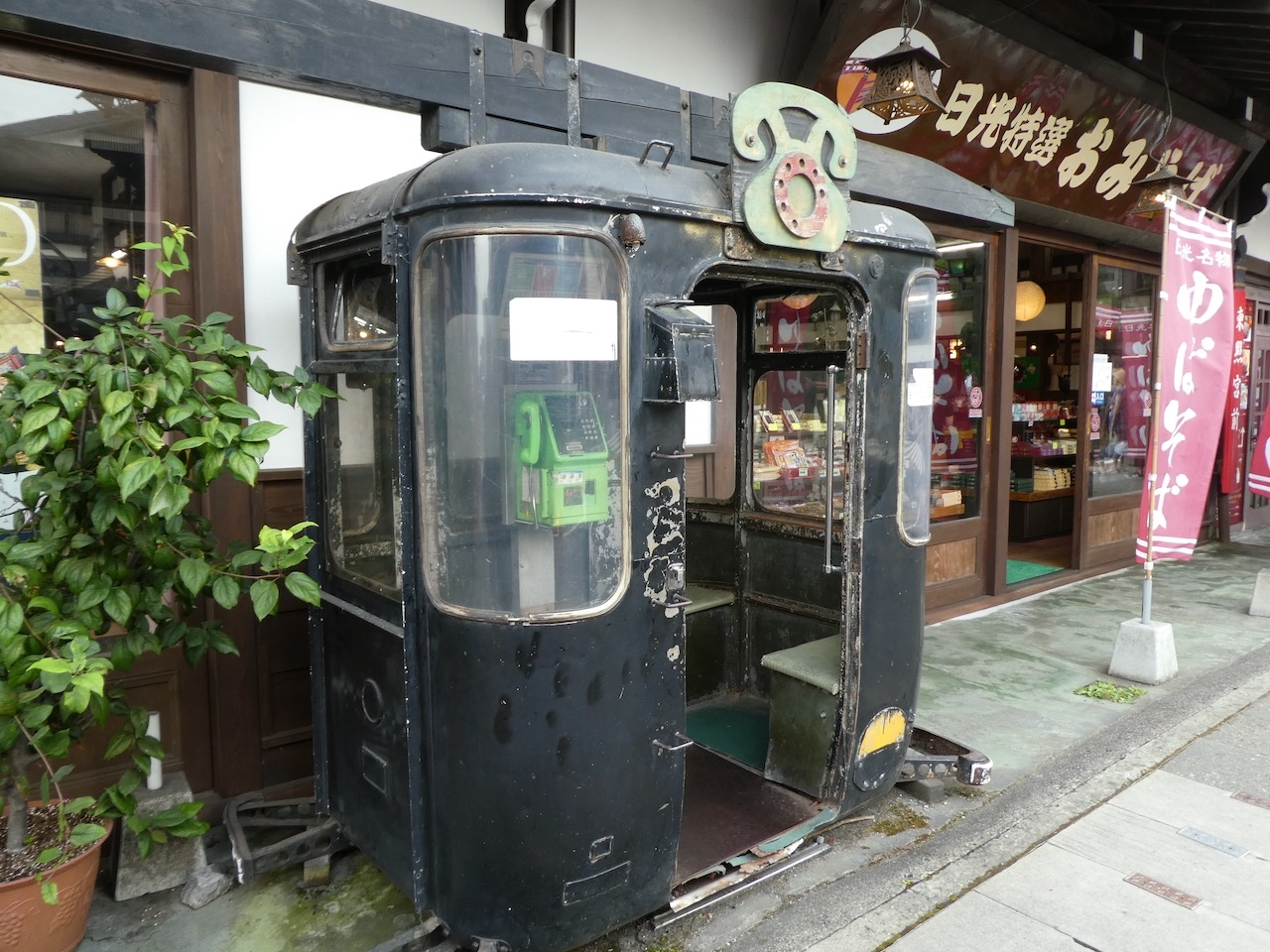 金谷ホテルの入り口、神橋のすぐ前、バス停すぐの好立地。建物も古い木造建築で格式があります。店の前には昔の明智平のロープウェイのゴンドラが真っ黒に塗られて電話ボックスになってました。