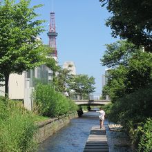 テレビ塔の裏辺りから狸小路の先まで創成川公園として川の縁が整備され、特にテレビ塔の裏辺りは川面に下りられる親水公園になっています。