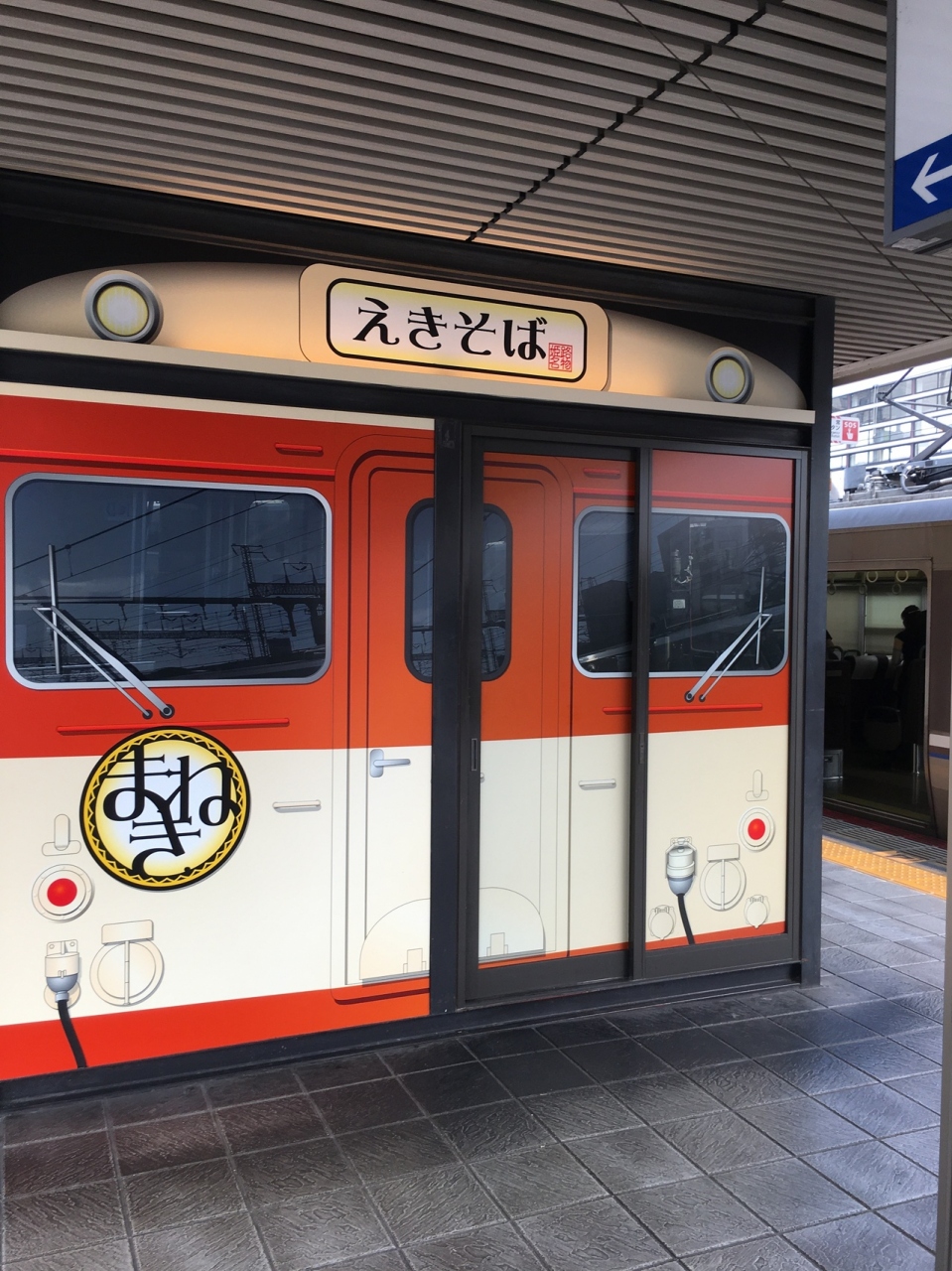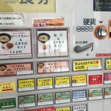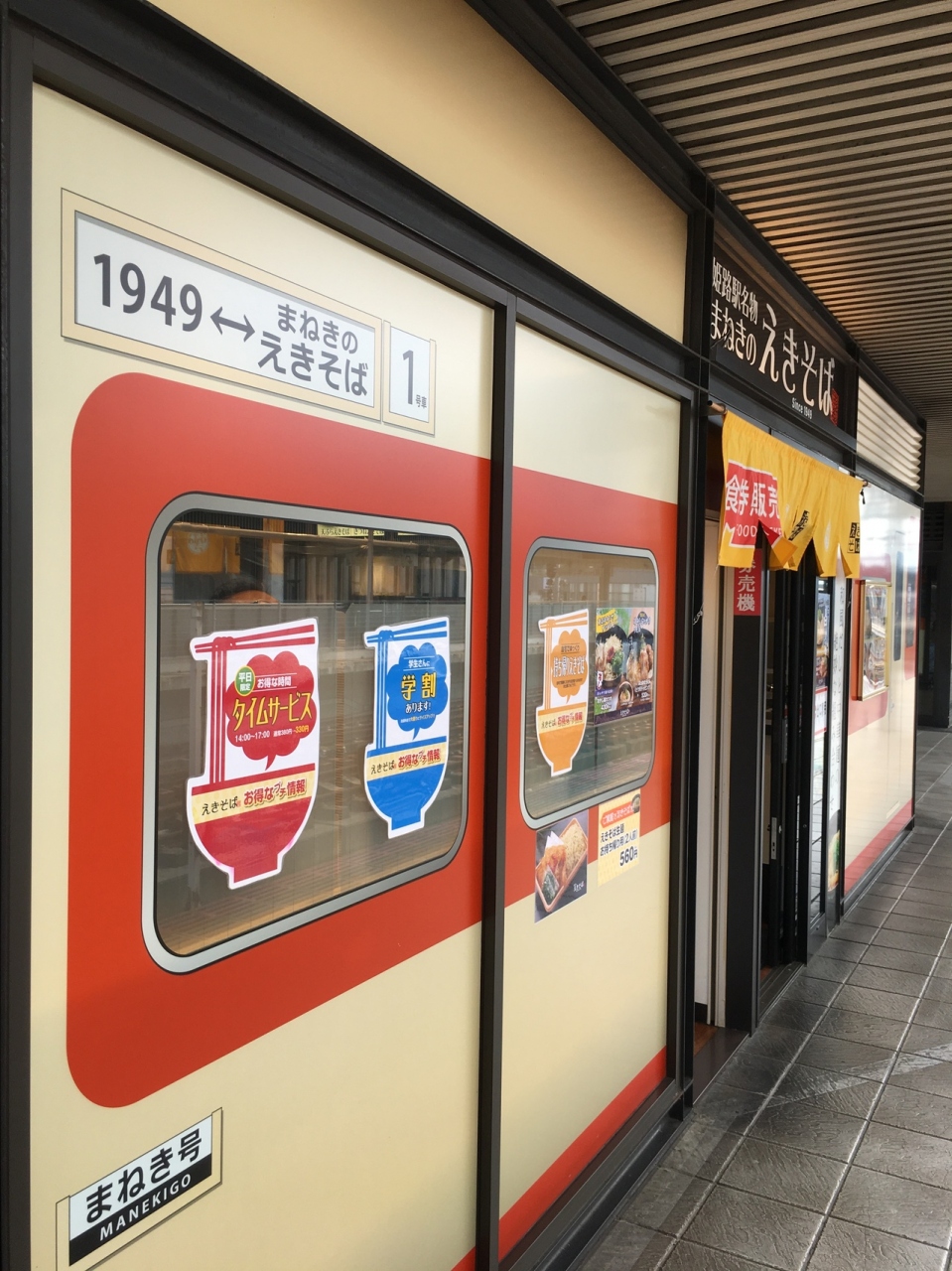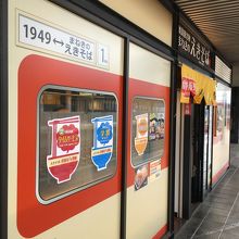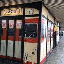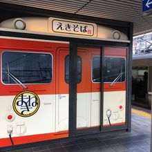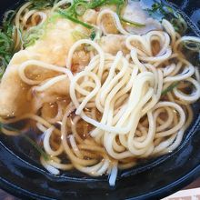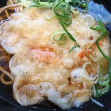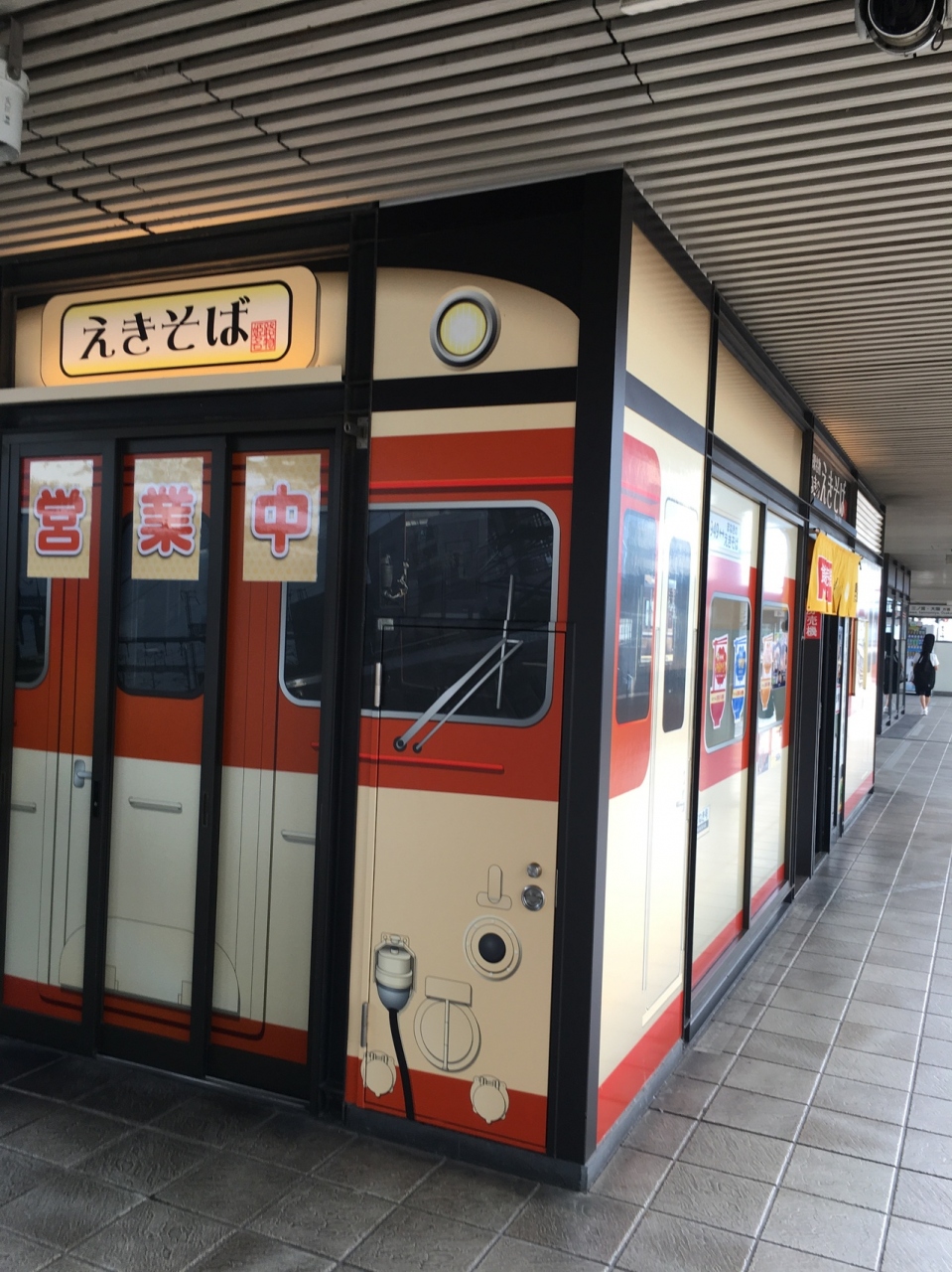 昔の列車の外観をかたちどっている箱形の店舗でした。セットものもありましたが、自動販売機で、天ぷらそばの食券を購入。蕎麦なのに白ぽい色で天ぷらのほかにはネギが添えてありました。シンプルな味わいが良かったです。