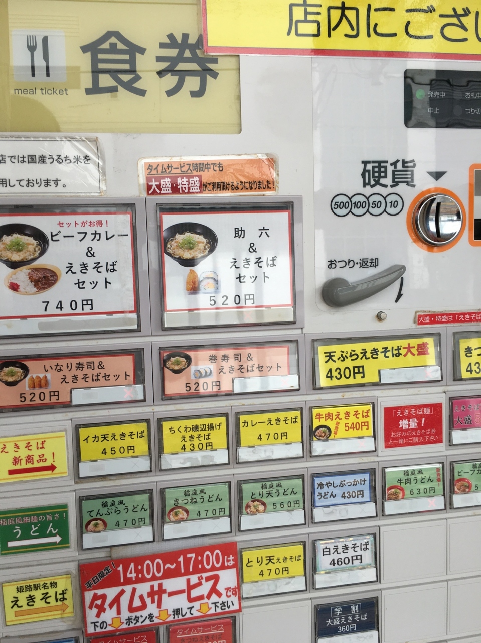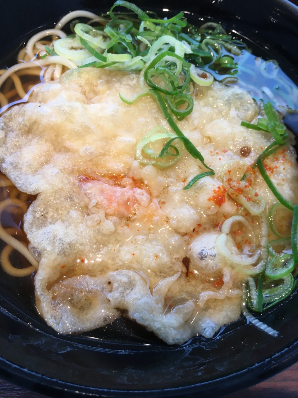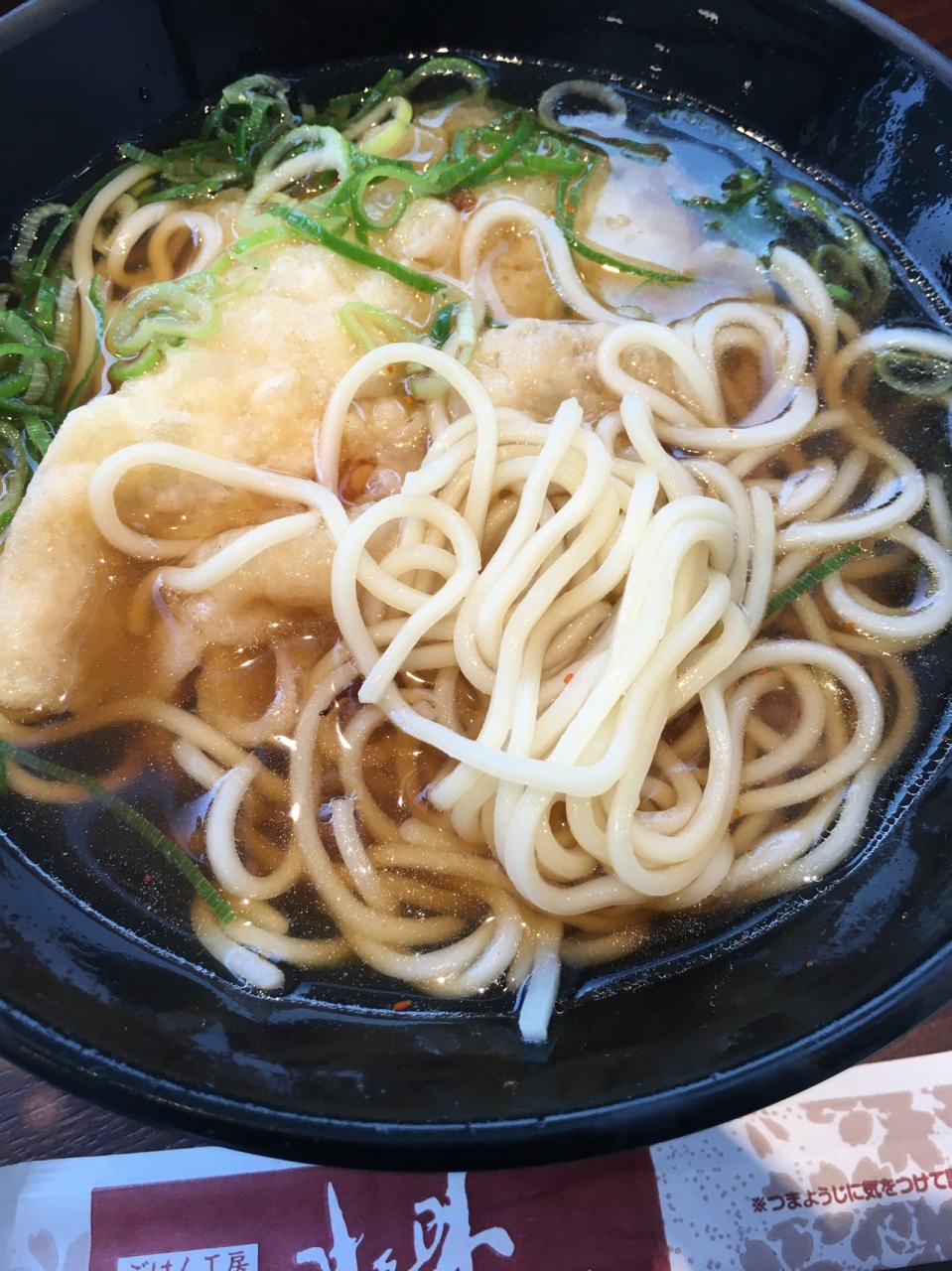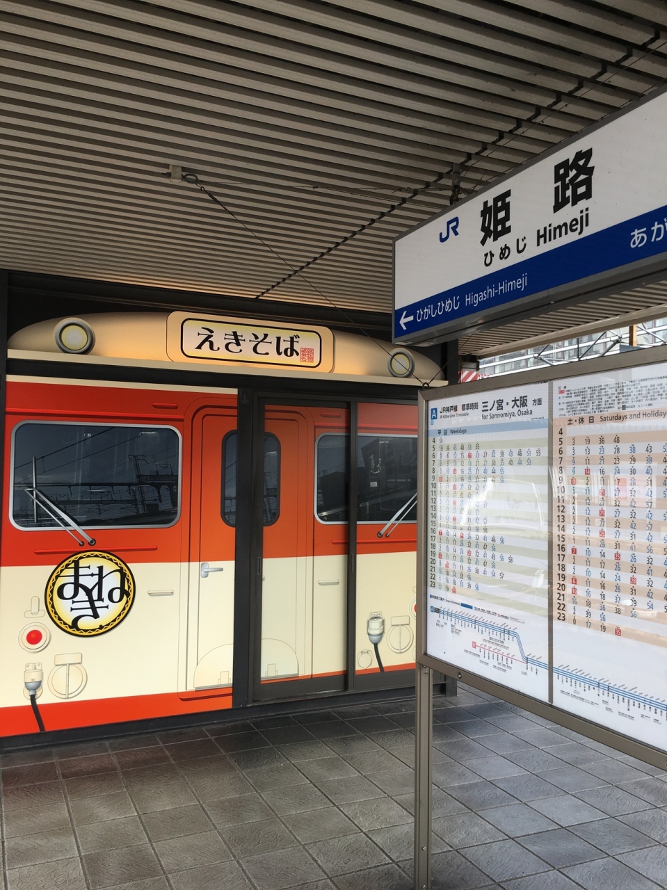 昔の列車の外観をかたちどっている箱形の店舗でした。セットものもありましたが、自動販売機で、天ぷらそばの食券を購入。蕎麦なのに白ぽい色で天ぷらのほかにはネギが添えてありました。シンプルな味わいが良かったです。