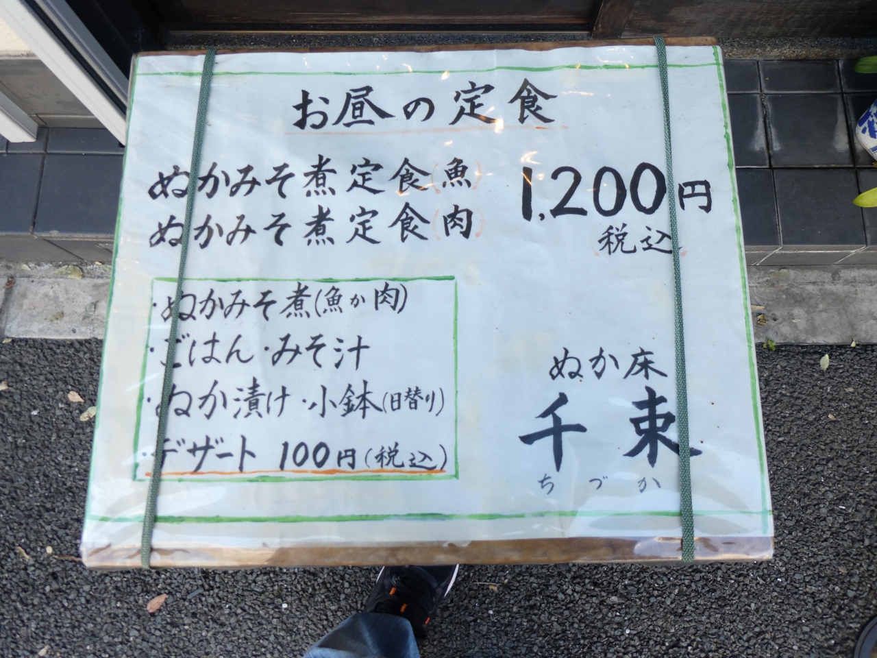 ぬか漬け専門店でランチはぬかみそ煮定食の肉か魚の2セット用意が¥1,200円で用意されています。テザートは別途100円で追加オーダー出来ます。