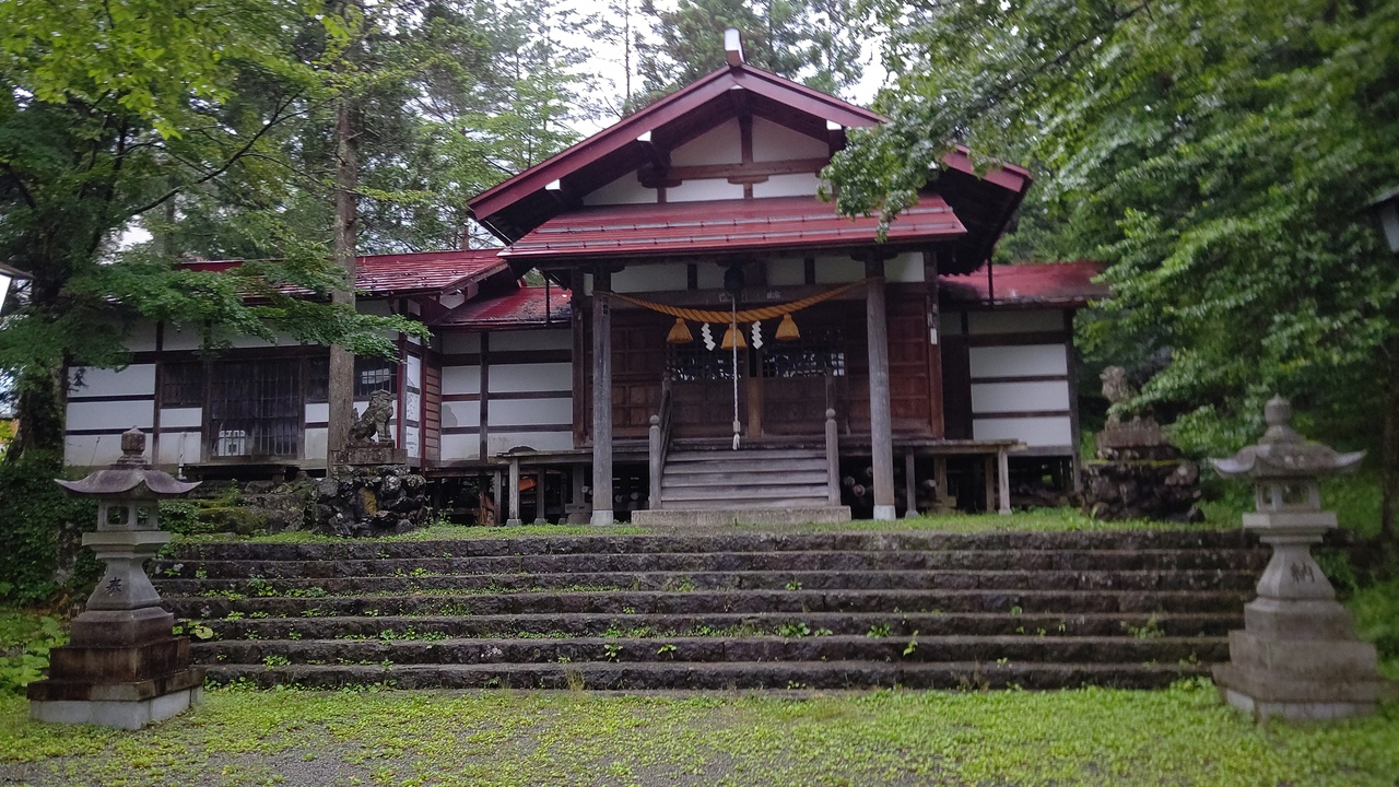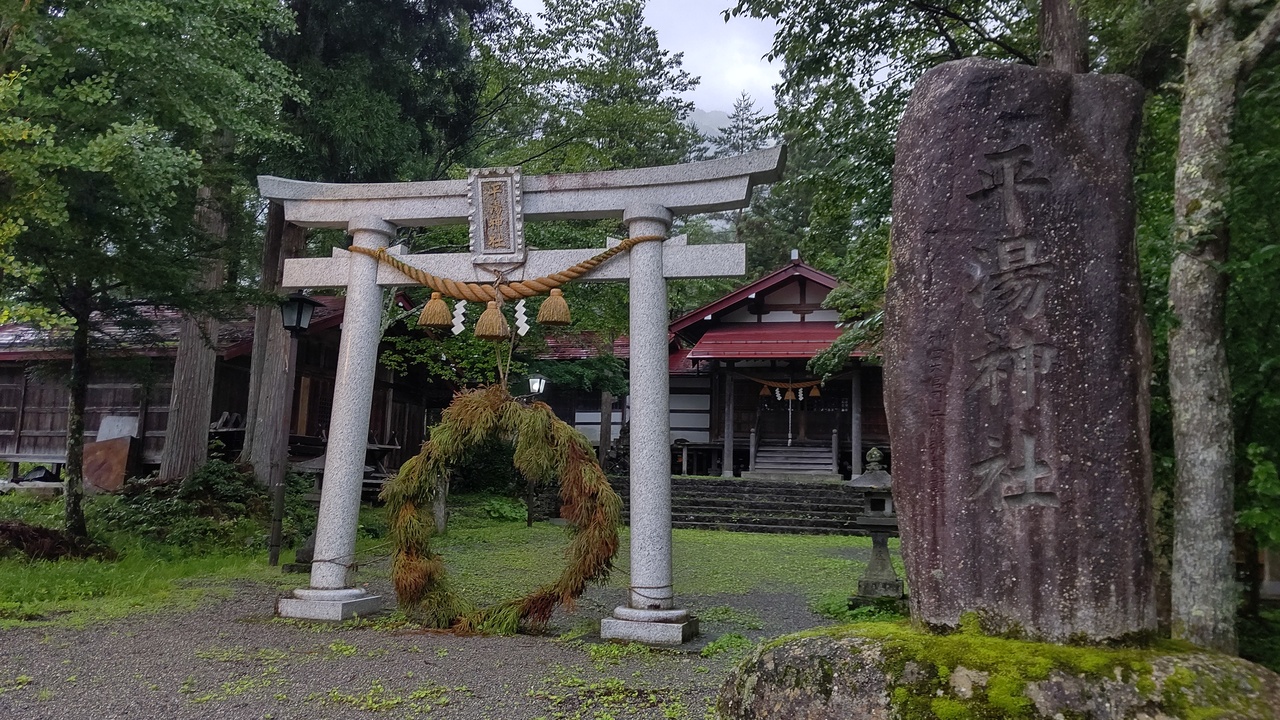 平湯温泉街にひっそりとたたずむ神社。創建は不明。白猿伝説によるそうです。この地になければ何の変哲もない神社に見えました。わざわざ訪れる場所ではないかも。脇で水車が回っていましたが、冬場は凍って動かなくなるのかな。