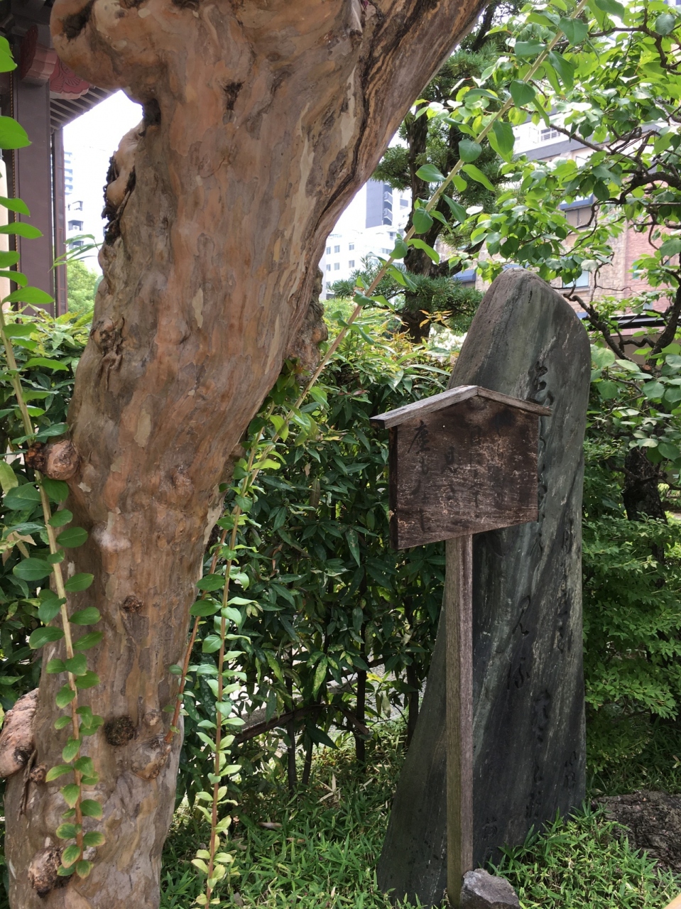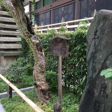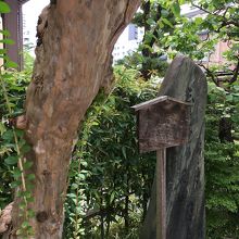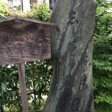 本堂の左側にあります。看板が色褪せていて読みづらく、見つけるのに苦労するかもしれません。石碑には文字が彫ってありましたが此方も読みづらかったです。縦型の変形の石碑で特徴ある形でした。草に囲まれた場所にあります。