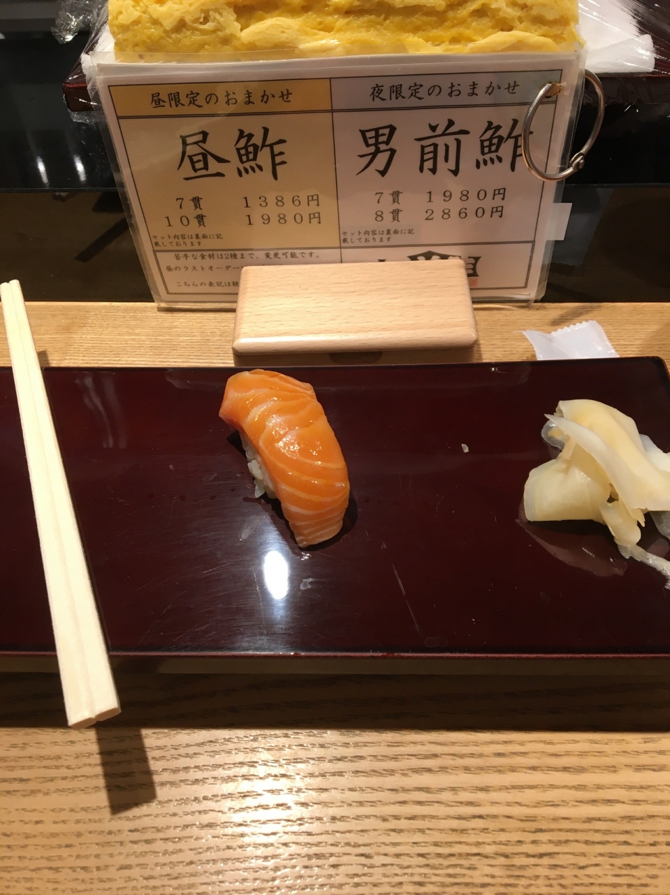 大名古屋ビルの地下1Fにある立ち食いの寿司屋さんです、いつも行列が絶えない店で前から気にしてましたが、運良く待たず入る事が出来ました。ランチは7品か10品のおまかせコースで単品もあります。赤酢のシャリと丁寧な仕事の寿司は大変美味しかったです。