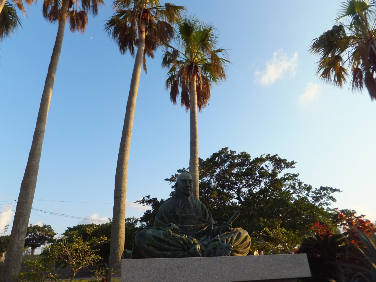 大河ドラマ「平清盛」の世界の人物が、遥か彼方にあるこの島に存在していた事に、深い感慨を受けました。いかにも南国の木の下で僧侶の銅像がある光景は、新鮮なイメージが残りました。町営体育館の傍らにあるので、周辺は良く整備されています。
