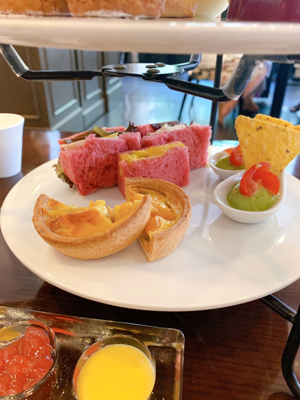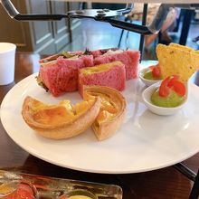 下段(セイボリー):かぼちゃサラダと鶏のクリーム煮のサンドウィッチ・青とうがらしのワカモレ・黄色トマトとベーコンのキッシュ