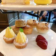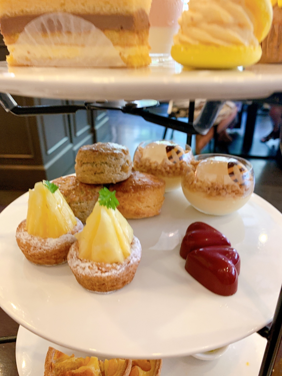 中段:フルーツタルト・バパマンガのムースとレモンジュレ・パッションのチョコレート・スコーン(紅茶・プレーン)