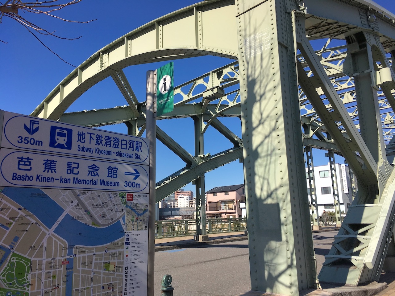 小名木川に架かる、沢山の鉄骨でできたアーチを備えた橋です。