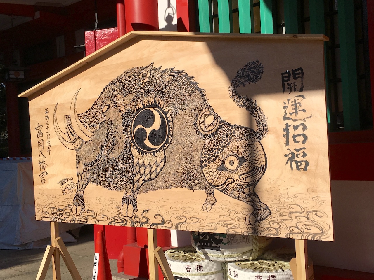 この年の干支は亥で、本殿の前にある巨大な絵馬に亥の絵が描かれていました。