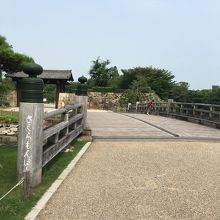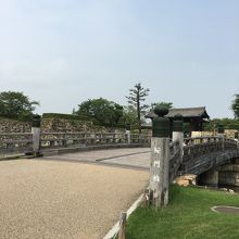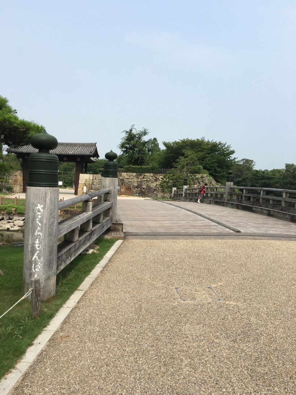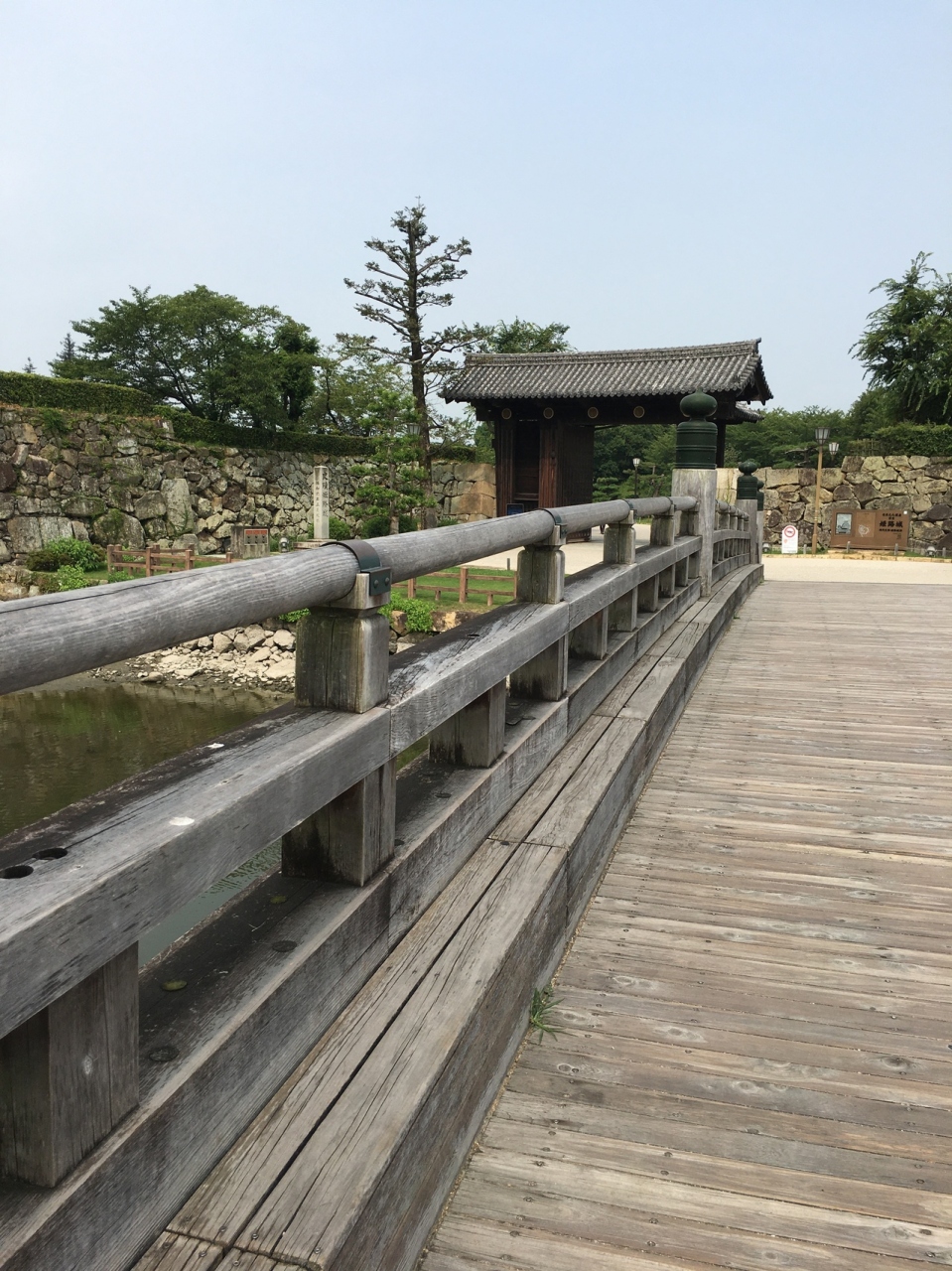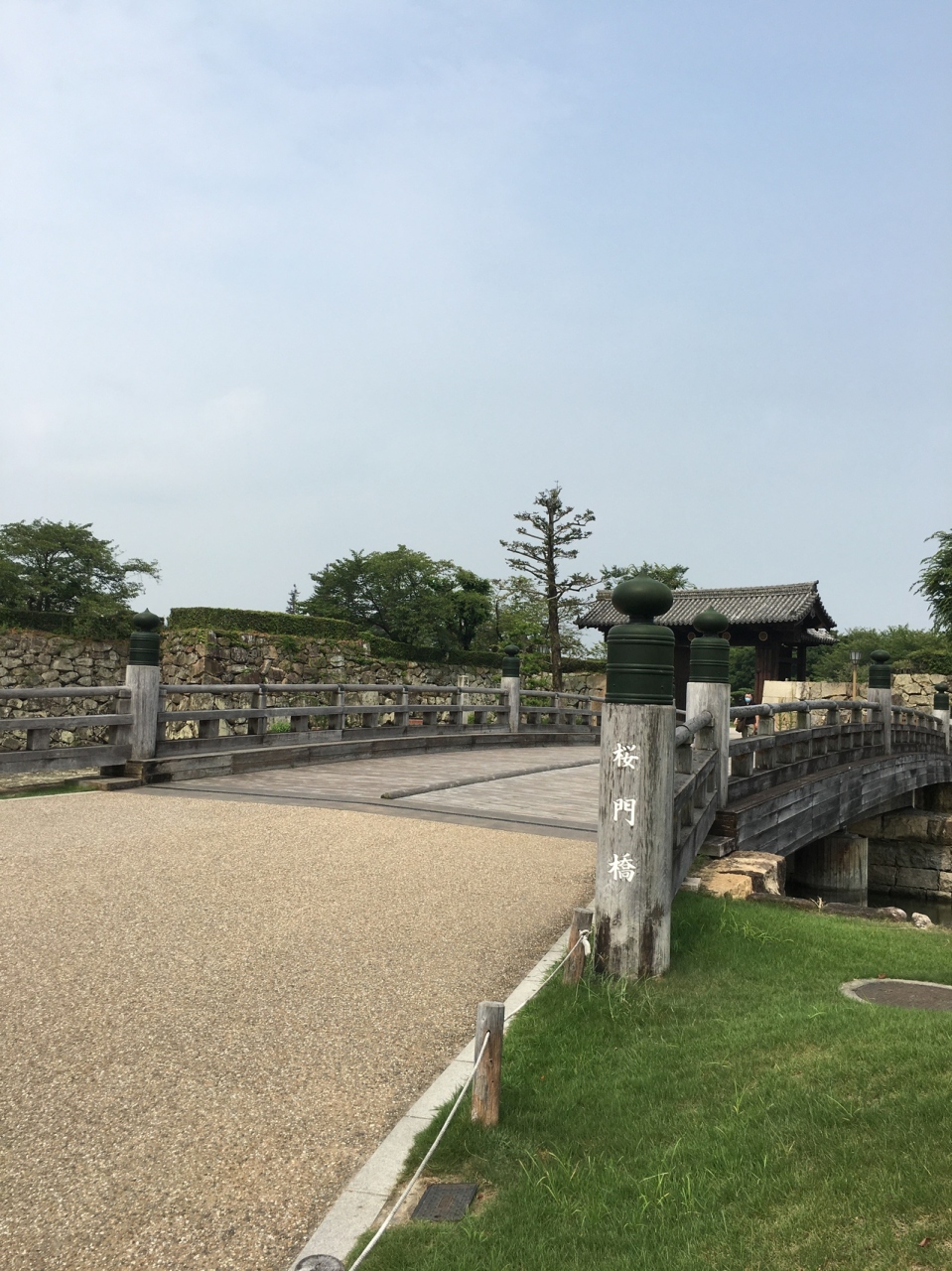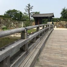 大手門前の内堀に架かる木の橋で、江戸時代ぽい雰囲気を醸し出していました。自動車は通れず人専用の橋ですが、ほんの僅か丸みを帯びていました。橋から内堀沿いの石垣等が見れ、内堀にはあまり水がなく浅い内堀でした。