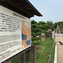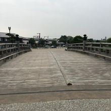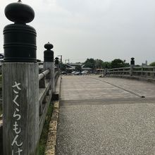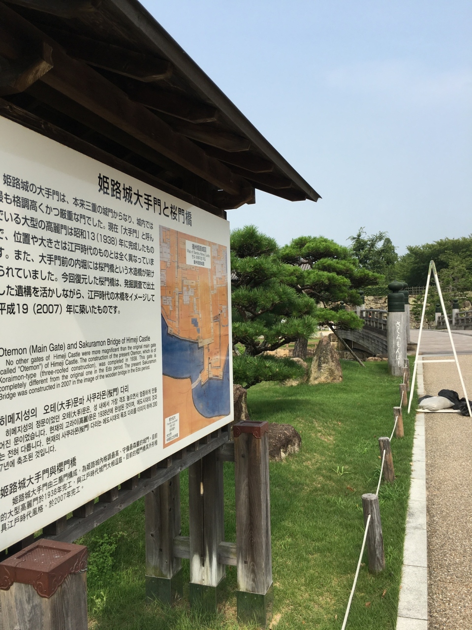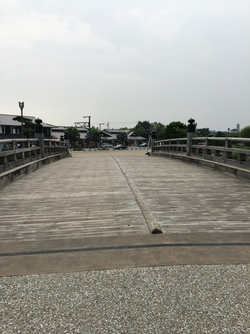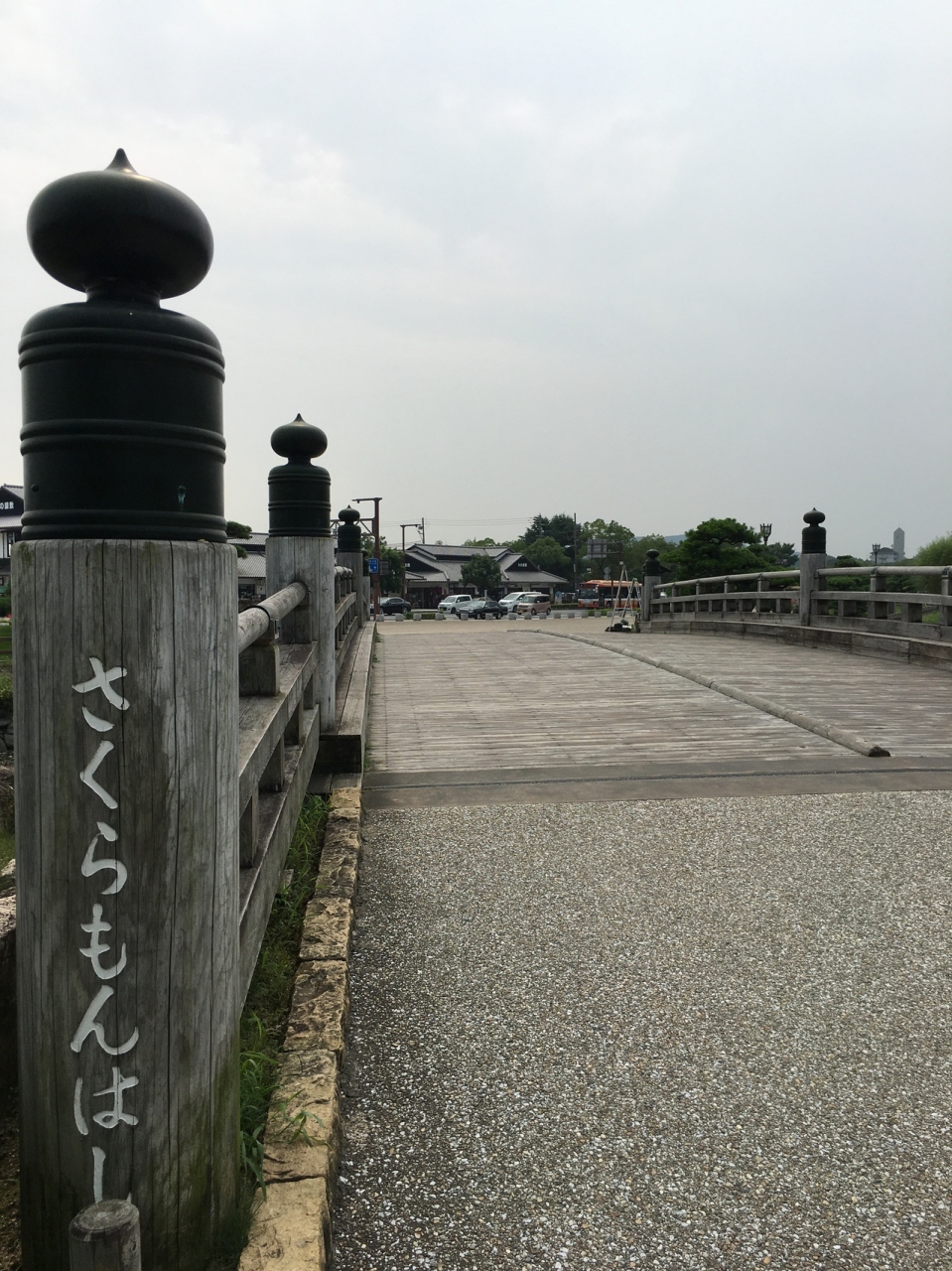 大手門前の内堀に架かる木の橋で、江戸時代ぽい雰囲気を醸し出していました。自動車は通れず人専用の橋ですが、ほんの僅か丸みを帯びていました。橋から内堀沿いの石垣等が見れ、内堀にはあまり水がなく浅い内堀でした。