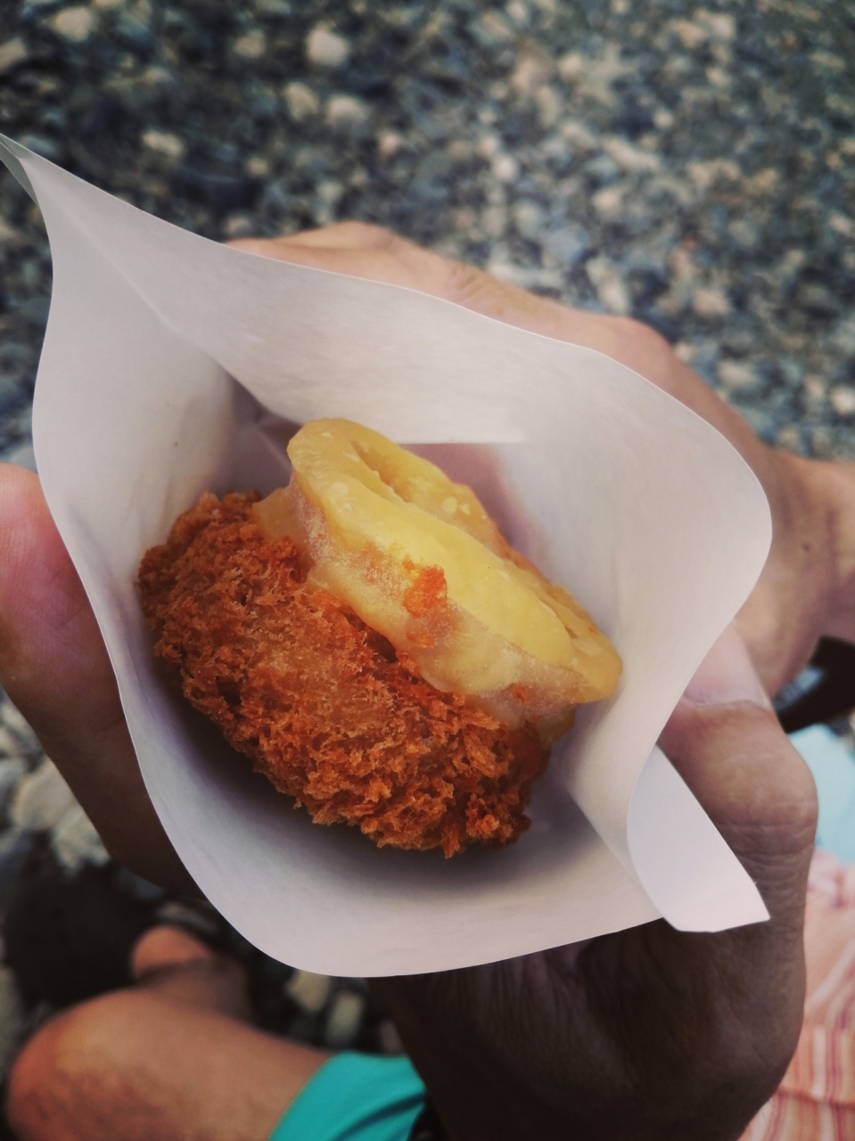 河原ではレンコンコロッケが売っていて、とてもおいしいので、おすすめ。