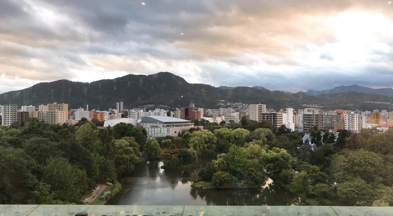 中島公園から曇っていましたので夕日は見えませんでしたが11階からの眺めは豊平館がみえてよかったです。