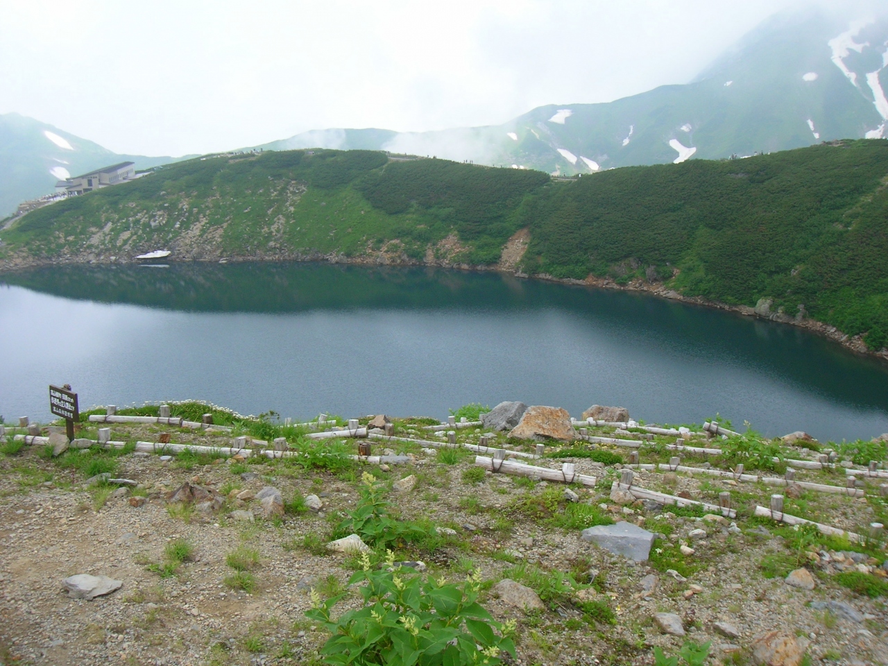 立山は雄大で美しい、室堂はその中のハイスポット、みくりが池は北アルプスで最も美しい火山湖、一番深い所は15メートルあり、深い青色の水面に吸い込まれそうになります、一周回ると15分ほど掛かりました、辺りに万年雪や高山植物がたくさん