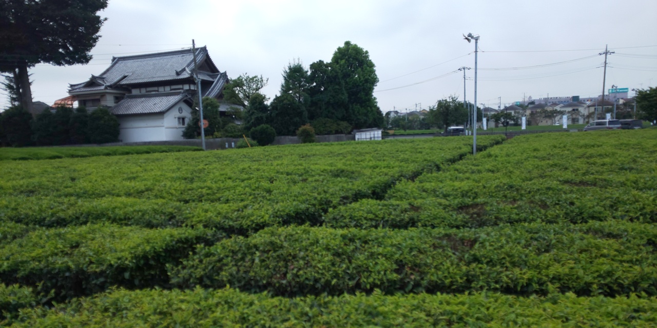 この付近は茶畑が多い地域です。この店舗は昔ながらの日本家屋のようなお店で、周囲には緑が美しい茶畑が広がっていました。