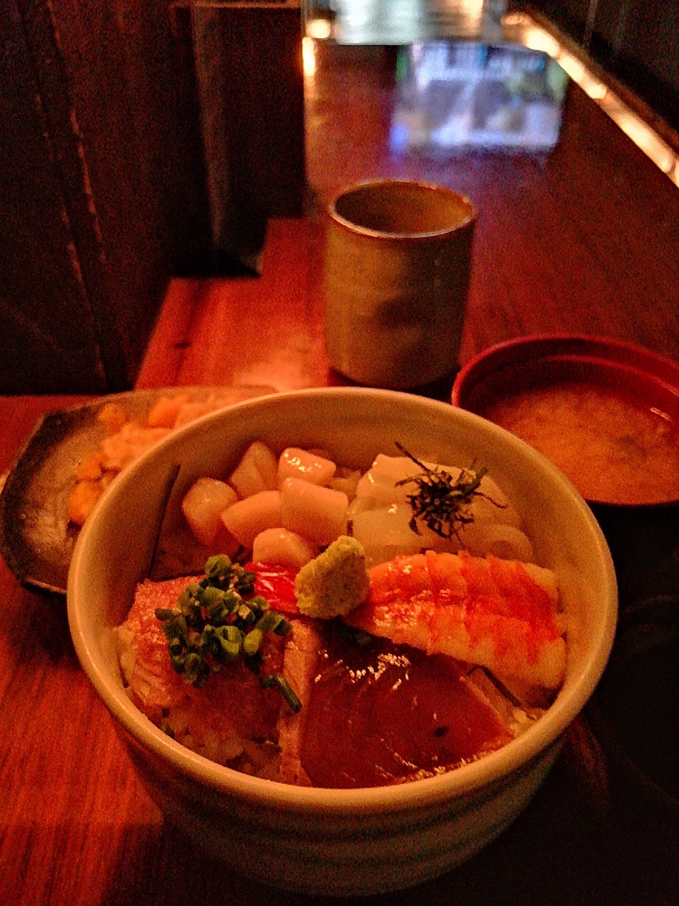 立ち食いの海鮮丼が500円で食べられると知って、行ってきました。
