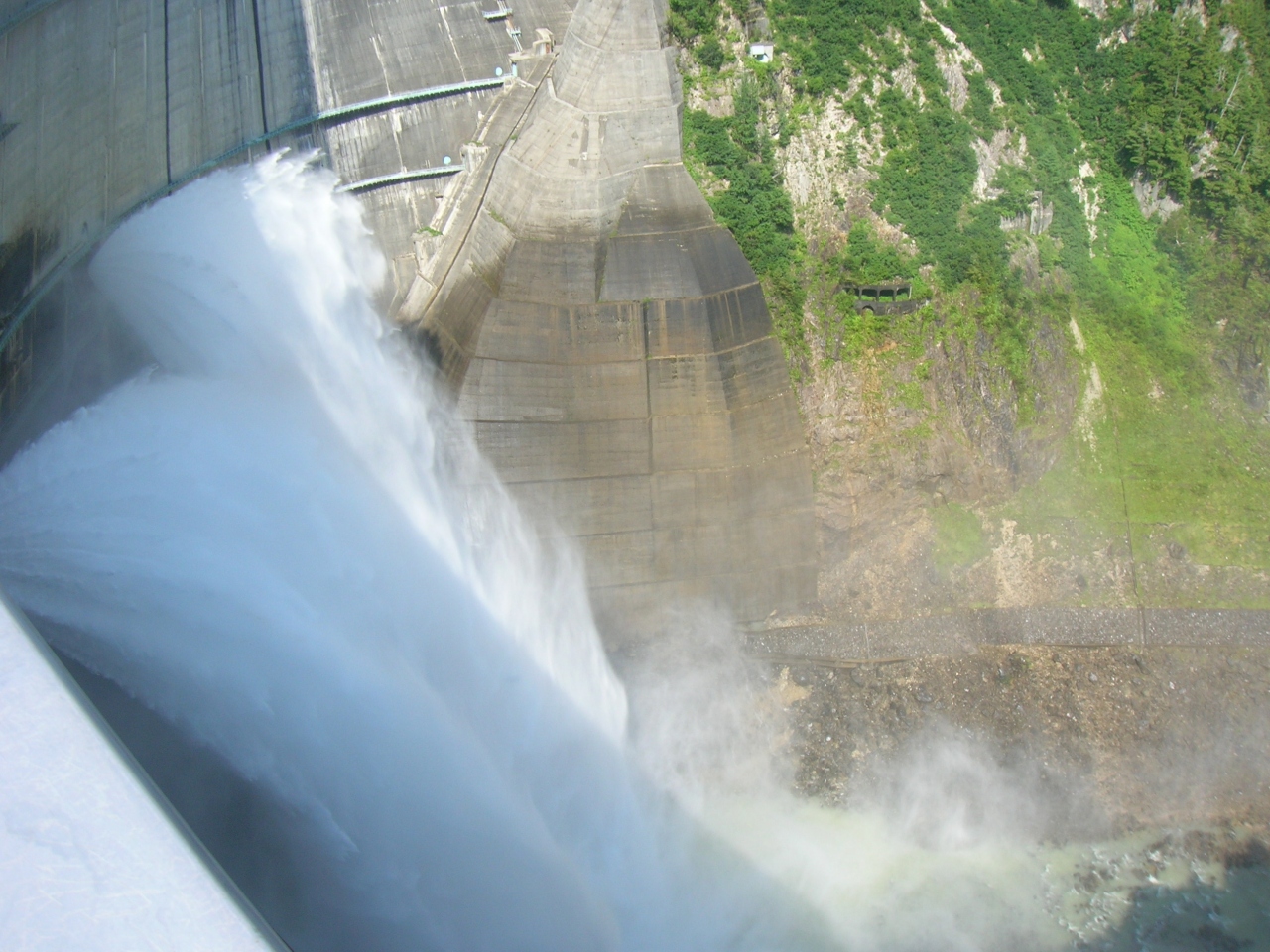 黒部ダム駅から黒部湖駅へは徒歩、えん堤の上を歩いて行きます、ダム側のダイナミックの放水に目を奪われ、圧倒されました、見た事のない大きさだったので。展望台からの眺めはさらにすばらしいでしょうが200段以上の階段を登り降りしないといけないので、虹も見れたから、好しとしました