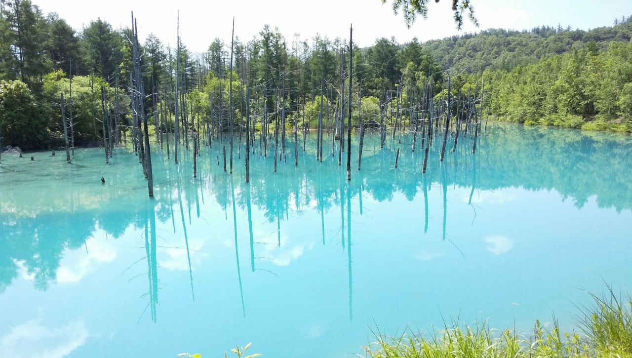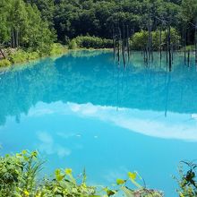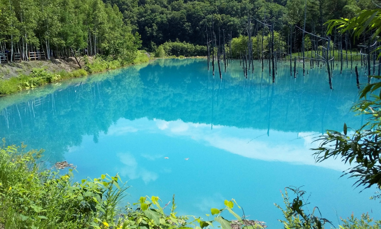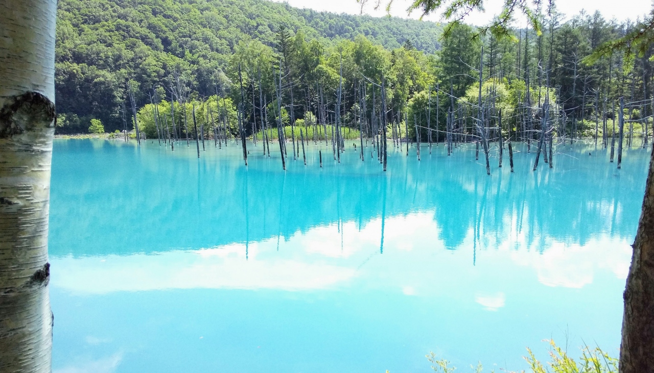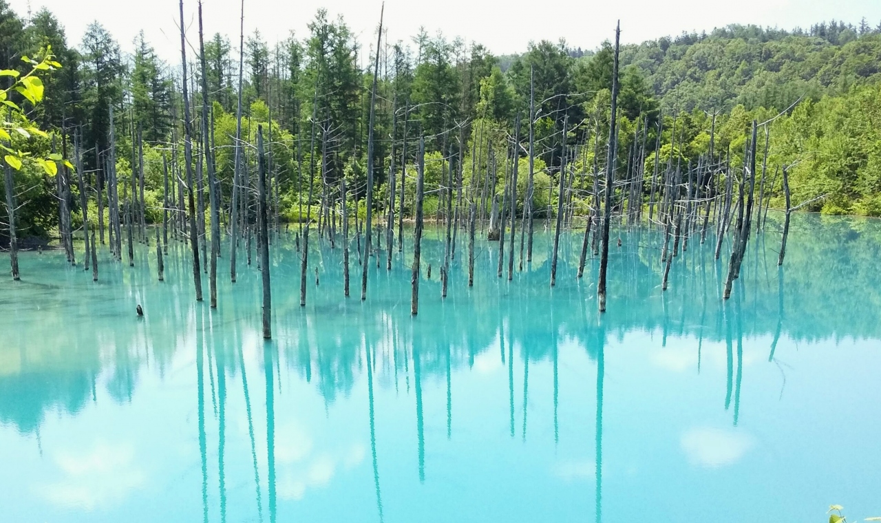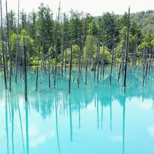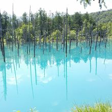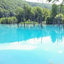想像していた以上に青く美しく、辺りの木々の緑や空の色・雲などを映して色が変化する神秘的な青い池が見られました。