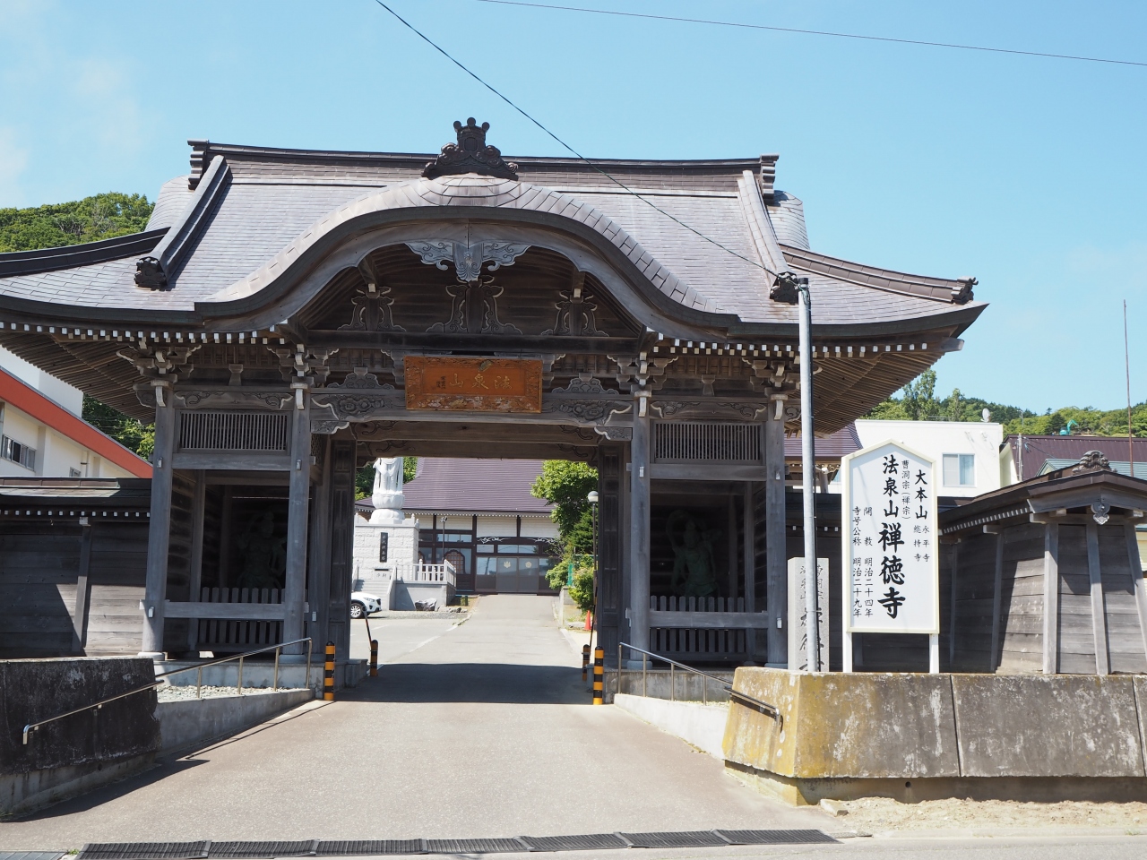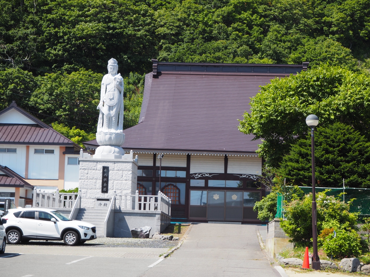 禅徳寺は稚内の市街地の背後にある小高い山の山頂にある稚内公園への登り道の入口付近にあります。禅徳寺は広い境内の寺で、入口の山門は四脚柱の大きなもので、本堂なもの立派です。本堂の横には、本堂の高さを上回る大きな白い像の観音様の像があります。観音像がいい目印になっている寺院です。