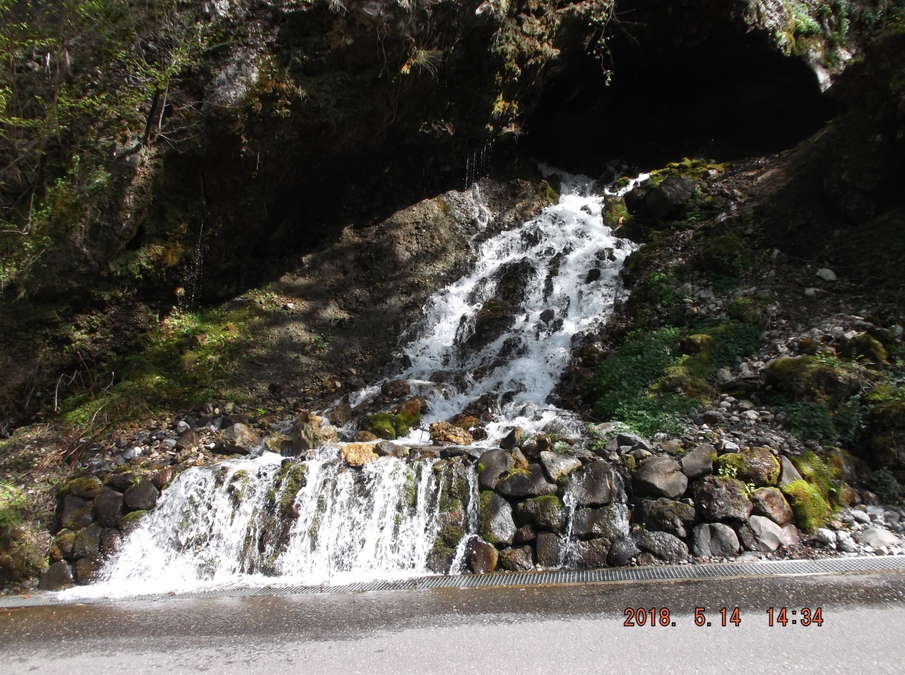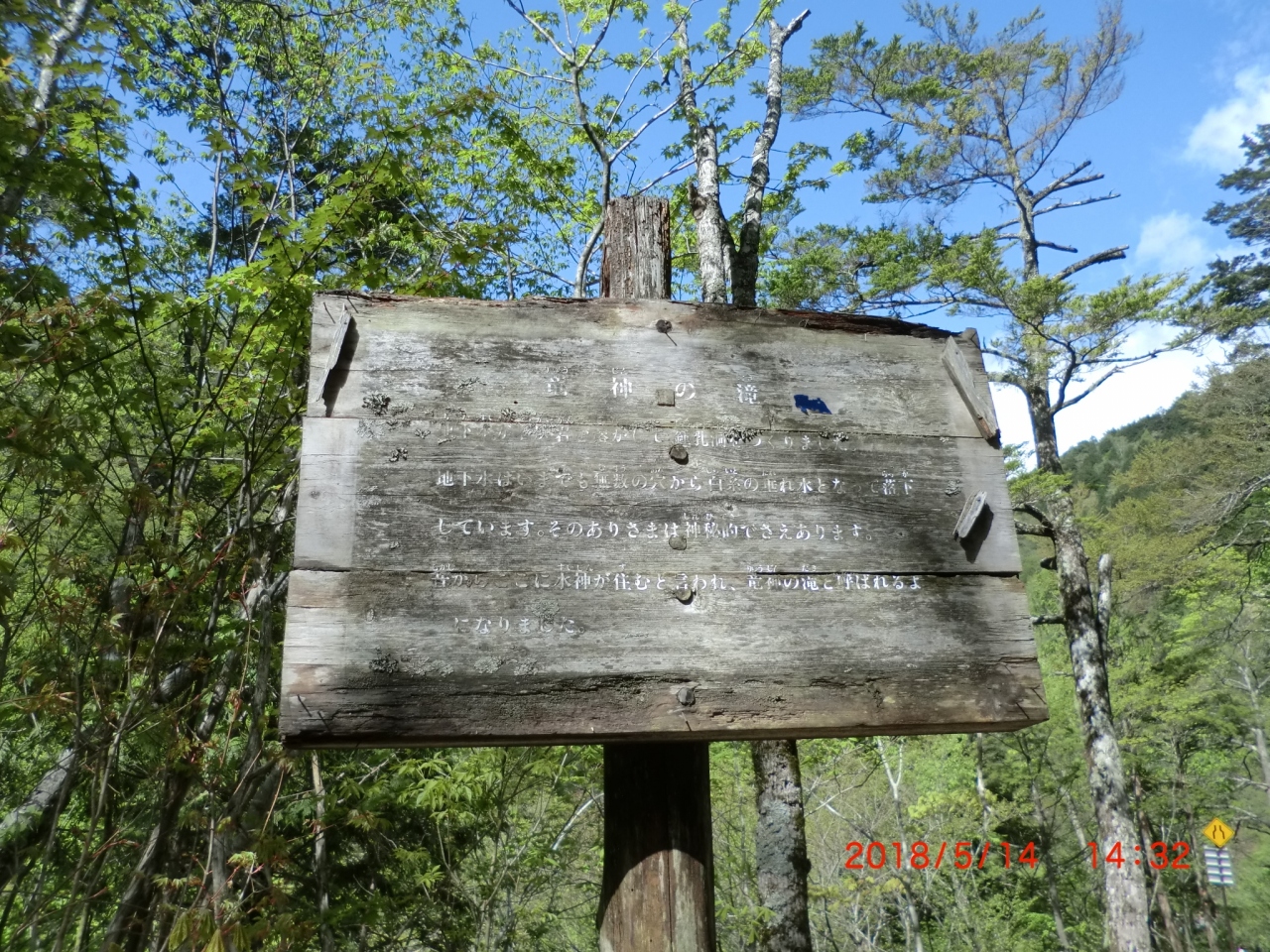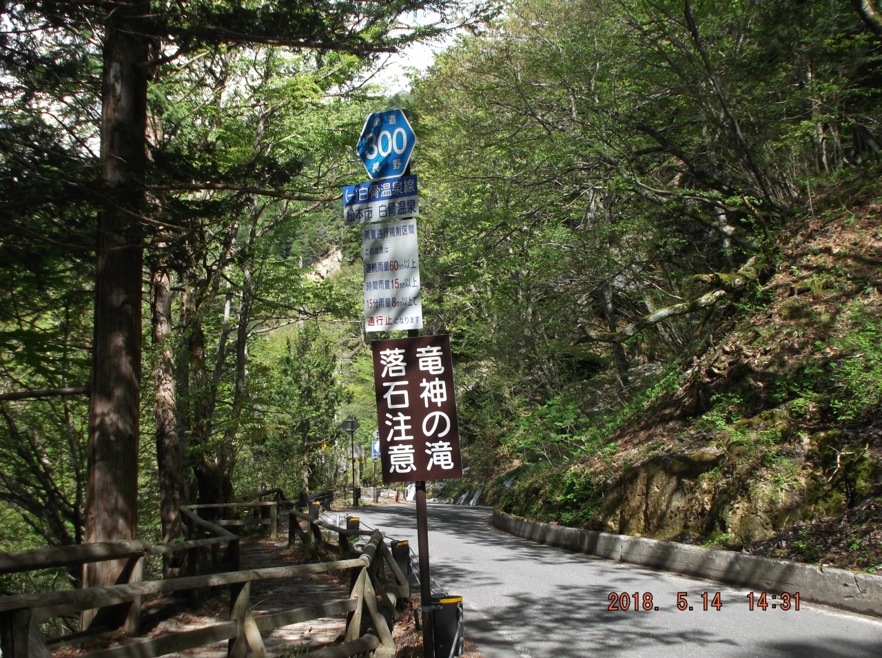 白骨温泉に宿泊しましたが、時間的に余裕があれば周辺で散策するスポットをいくつか捜していたら「竜神の滝」がありました。行程が順調でチェックインには早いので行ってみました。駐車場は工事用のダンプが停まっていてダメで道端に停めました。すぐ近くに岩の割れ目から水が落ちていました、滝なのか湧き水なのか判りませんでしたが確かに道路脇に「竜神の滝」看板を見つけて納得しました。少しガッカリしました。