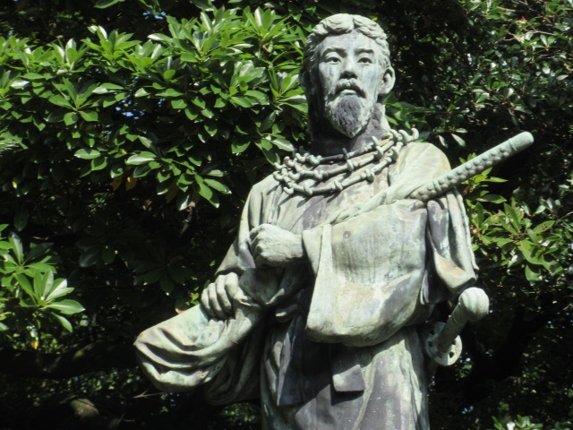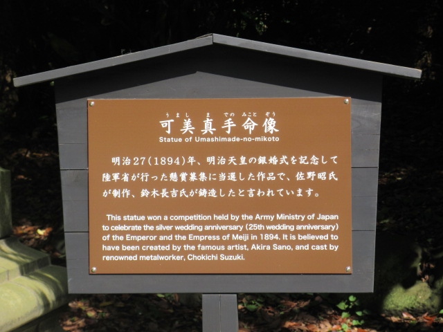 東京の名園、浜離宮庭園に中の御門から行きましたが、そうすると比較的すぐにこの銅像に出会えます。松林の中に建っているのですが、台座もあるのでなかなかの大きさです。「うましまでのみこと」と読むそうで、神話での軍神だそうです。確かに武器のようなものを持っている、りりしい銅像でした。