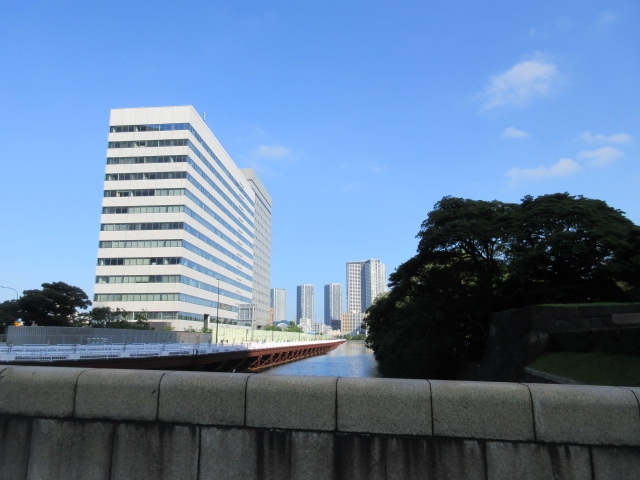 浜離宮庭園に行った際に、大手門橋という立派な橋を渡ったのですが、その上から川を眺めました。この橋が架かっているのが築地川で(最初は流れが緩やかなので堀かと思いましたが)二級河川で隅田川から分離して、浜離宮を通ってまた隅田川に合流するそうです。首都高速の建設で川の流れも変わったそうです。奥の方には水門もありました。