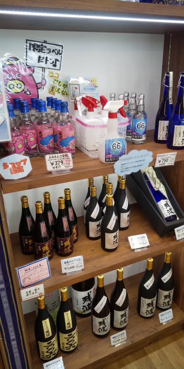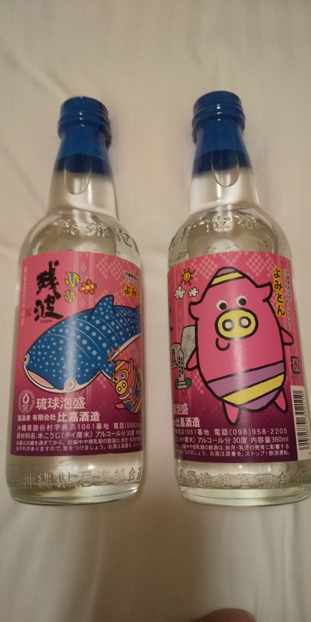 また工場直売所限定品の可愛らしいラベル(青のジンベイザメ、ピンクのよみとん)の泡盛は、お土産に最適です。
