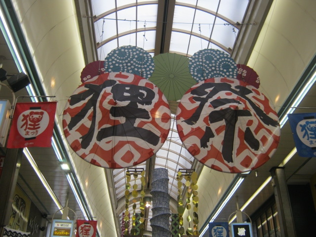 狸まつりということで、毎年夏には色々なイベントやバーゲンなどで盛り上がる季節ですが、やはりこの年は控えめな風情でした。ただ、歩きながら天井を見上げていると、色々な装飾が見られて、ビジュアル的には十分に狸まつりの楽しい風情を楽しむことが出来ました。