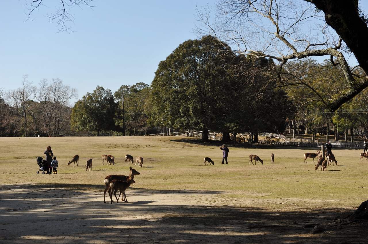 奈良公園の一部というのか、春日大社の一部というのか。ともかく広大な芝生が広がるエリアだ。奈良市という県庁所在地の一等地に人工物ではないこんな広場があるのだから、奈良という街の特異な構造がうかがいしれる。奈良時代の和歌にも登場するいにしえから広がる緑。くつろげそうな感じだが、鹿がそこここにおり、思ったより安心はできないが。