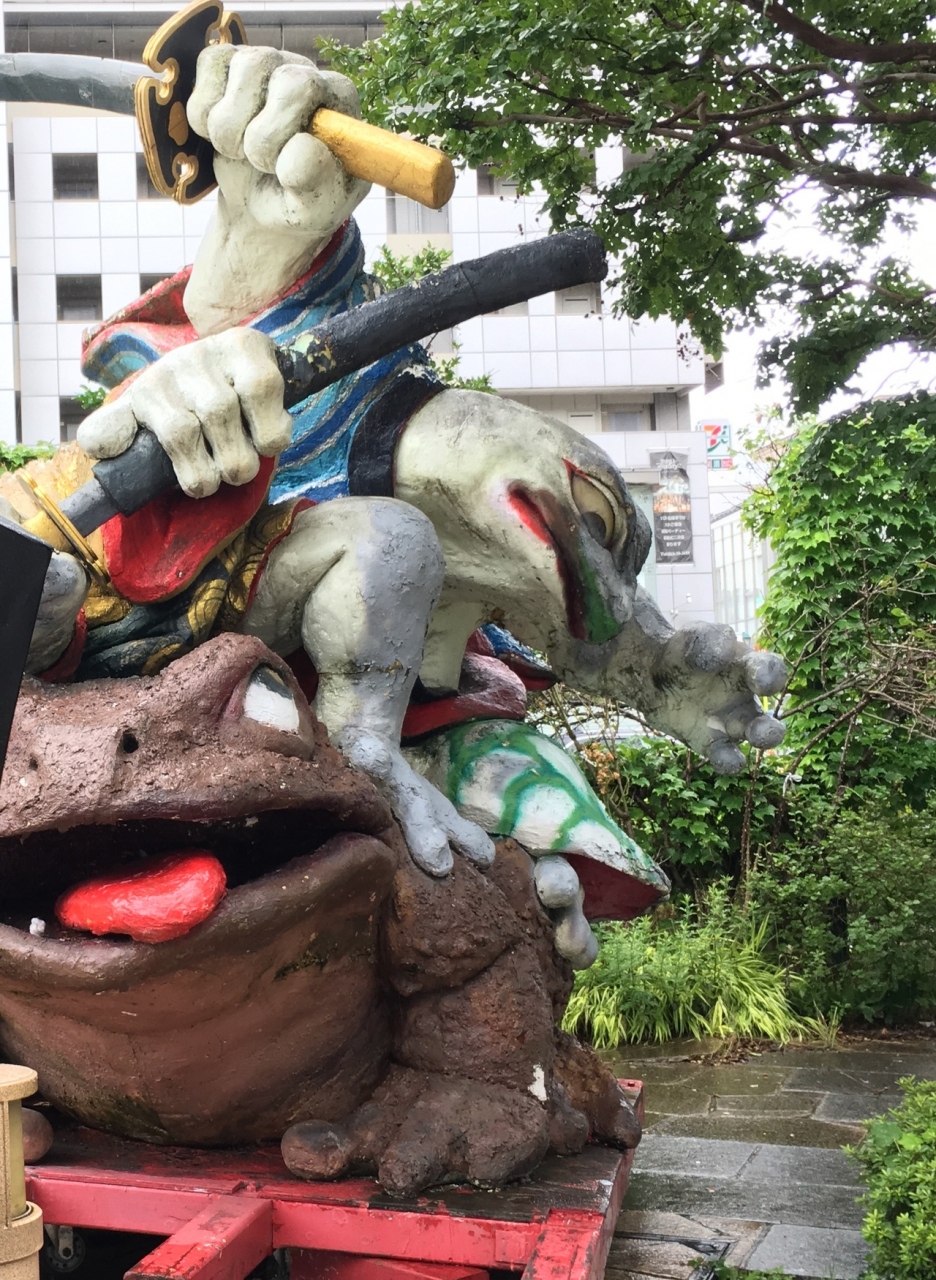 駅から松本城に向かう途中で出くわしました。グレーの地味なモニュメントが多い中、派手で迫力があって、立派なシンボルになると思います、ガマ侍の奥がなわて通り、左手に交番、その奥に四柱神社、通りを行くと松本城へ続いてます