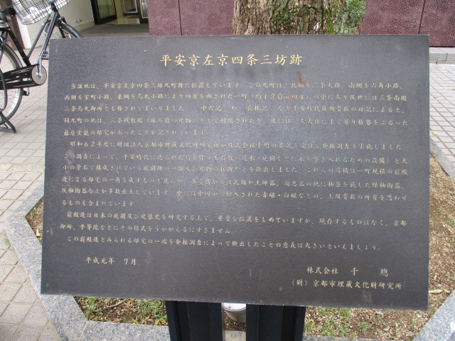 昭和62年に行われた発掘調査で、平安時代に造られた庭園跡の一部及び建物の柱跡などを検出しました。これらの遺構は一町規模の寝殿造による邸宅の一角をなすものと見られ、各遺構からは瓦類や土師器、須恵器の他に釉薬を施した陶器などが多数出土されました。今は当時の面影はないです。碑の後ろに大きなくすのきの木が立っていました。