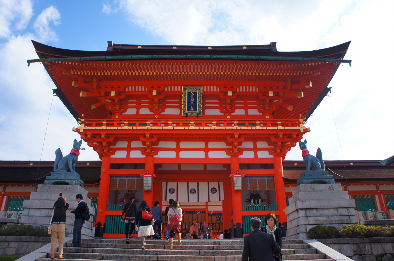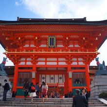 伏見稲荷大社の本殿にたどりつく前に通る門です。この楼門自体も、色鮮やかな朱色の門でかなり大きくて立派でした。こちらの門は豊臣秀吉が寄進したものなのだそうです。楼門の手前には2頭のキツネの像がありました。