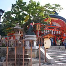 伏見稲荷大社は奥のほうにある千本鳥居が有名ですが、その千本鳥居にたどりつく前にこちらの本殿があり、お参りしました。本殿の横あたりに御朱印がいただける受付所がありました。また、こちらの絵馬はキツネの形をしていてユニークでした。
