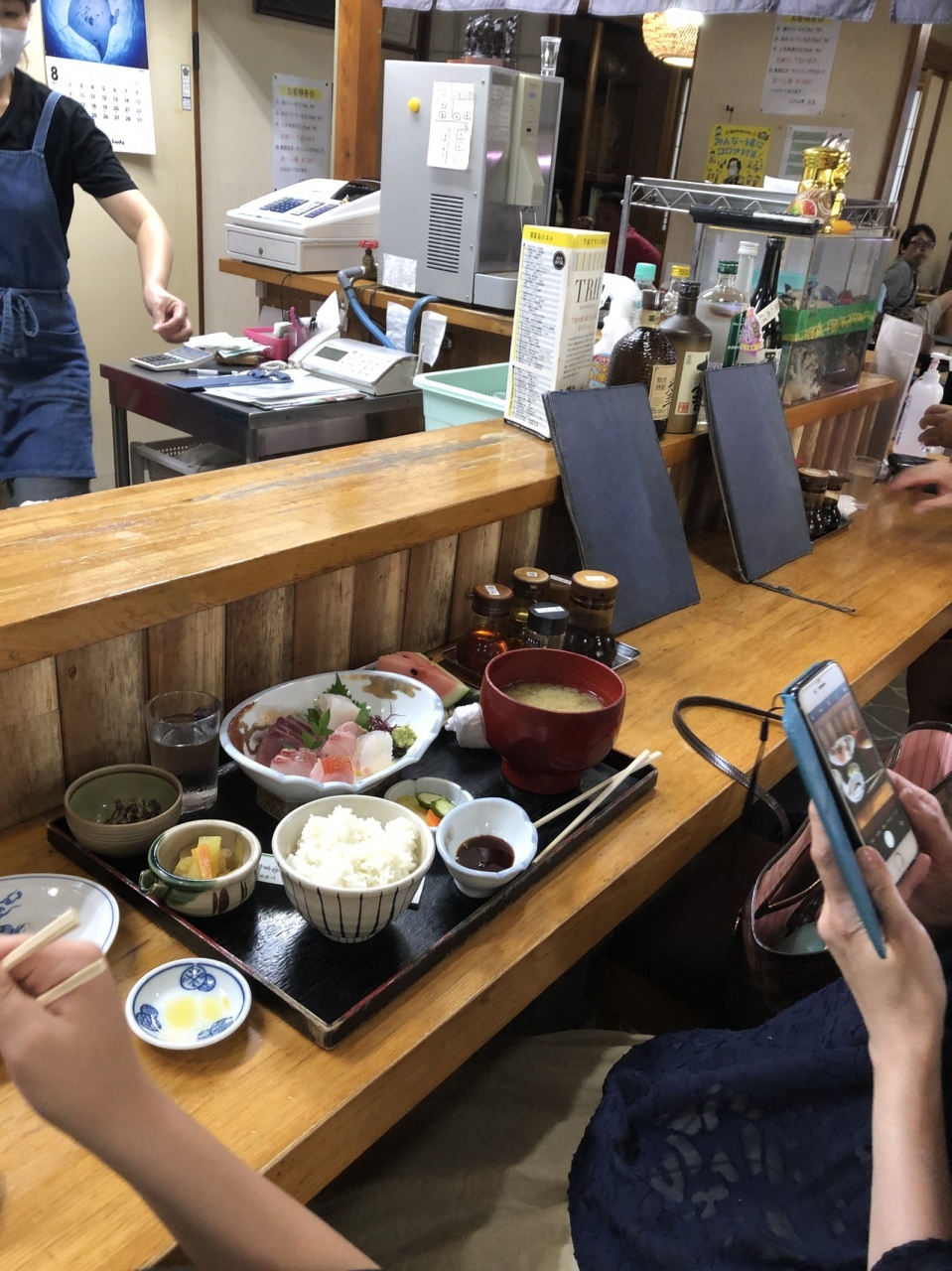 刺身、天ぷらなどの定食の他、金目カツ丼やサザエ丼といった丼もの、ラーメン、餃子など豊富なメニューはどれも美味しかったです。定食に付いてくる味噌汁は磯で拾った貝を適当にぶち込んでいるような感じですが出汁がしっかり出てます。付け合わせの南蛮漬けもアクセントになって飽きのこないものでした。ラーメンも魚介系で、多分アラや小魚で出汁をとっているのではないかと思います。