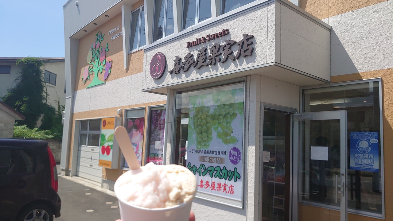 スイーツの販売も行っている果物屋です。暑い日だったのでアイスを選択。シングル400円、ダブル500円と値段はちょっと高め。福島の桃を使ったピーチジェラートとくるみミルクをダブルでいただきました。桃の味が薄めでした。