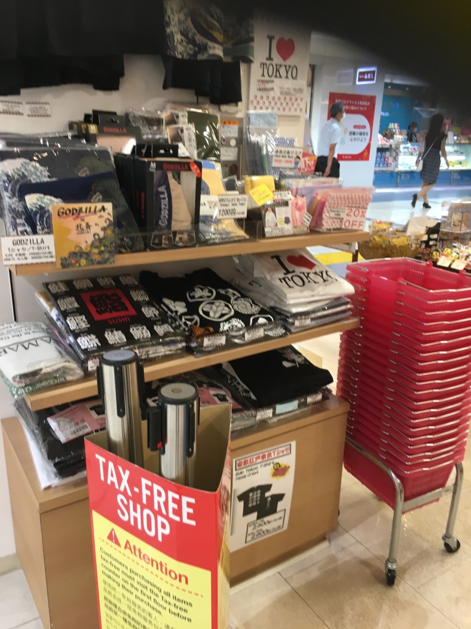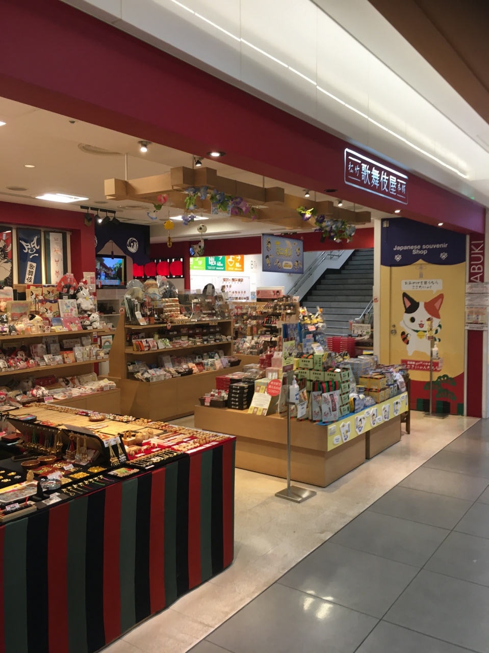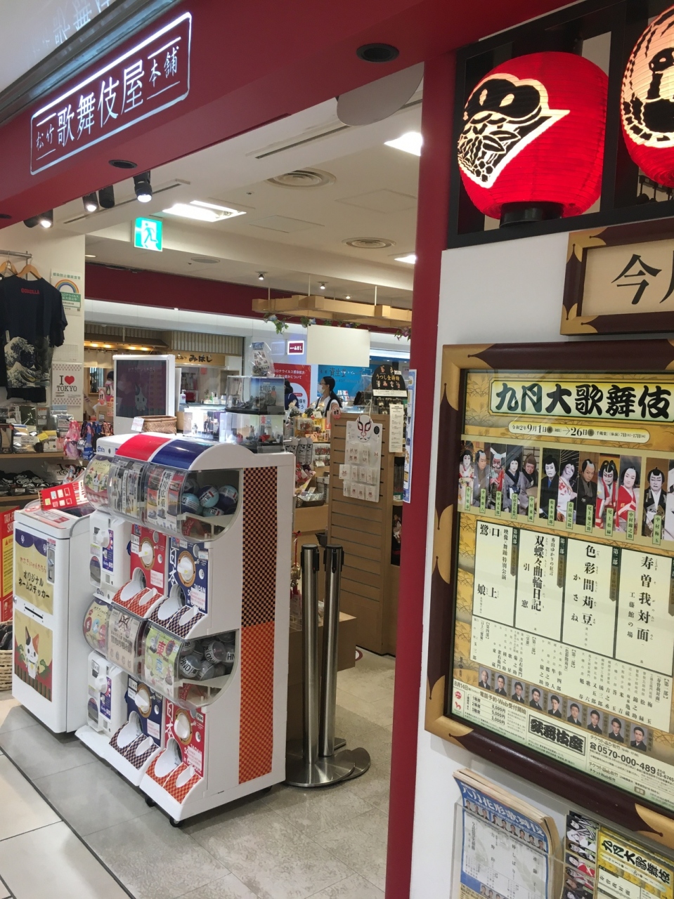 寿司のTシャツとゴジラのTシャツの良いデザインのものが売っていました。日本的な小物が多く売っていて、店の端では職人さんが何か作っていました。歌舞伎座の紹介をしたポスターが貼ってあり、ガチャガチャの品も日本的でした。