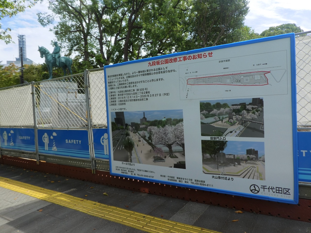 九段下駅から千鳥ヶ淵に行く坂道、お堀に沿った幅の狭い公園が造成されていました。歩道が広がって公園になったと考えた方がよさそうです。灯台がひとつ。銅像が2つ、目だってました。お堀側がやや高く、段差があり、スロープもありますが、階段になっている部分が多いので、きちんと足下を見て歩きましょう。(像を見上げててひっかかりました)