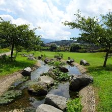 一面芝生の公園。東屋もあって、お弁当を広げている家族も見受けられました。管理棟もあってトイレ・多目的トイレも完備。飲み物の自動販売機もありました。