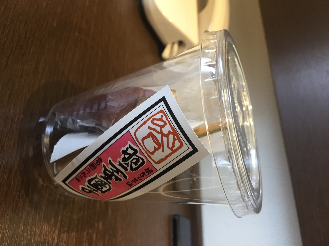 一人でちょっと食べるのにちょうど良い、餡団子と焼団子 それぞれ2つの串団子がプラカップに入ったものが置いてある。